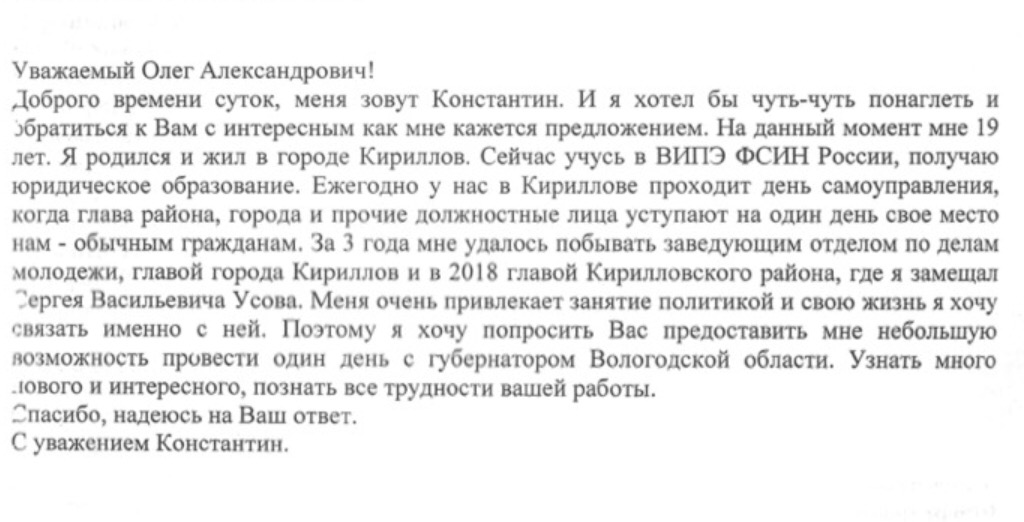 Олег Кувшинников поделился в соцсетях любопытным предложением, которое недавно поступило к нему на почту. Один из учащихся Вологодского института права и экономики предложил главе региона уступить ему место губернатора на одни сутки.