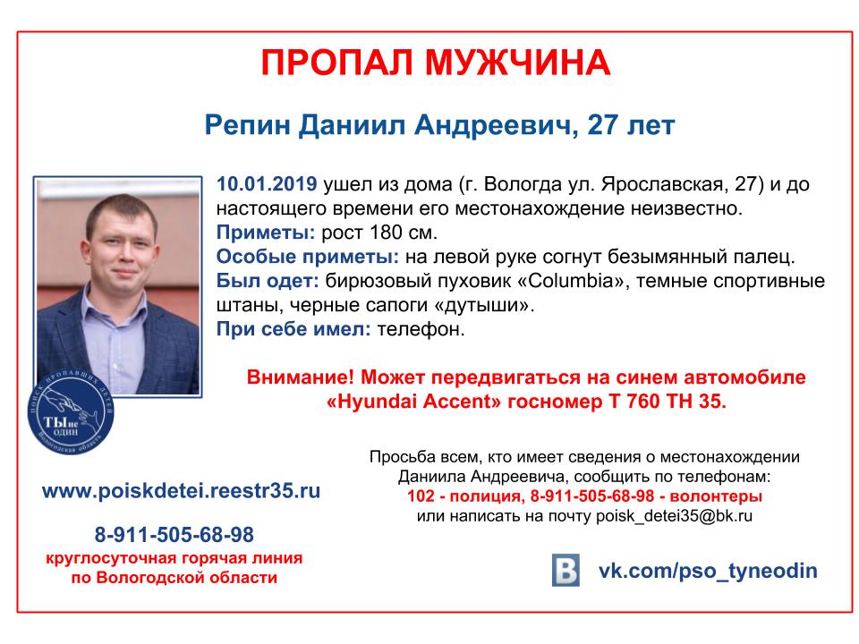 Напомним, 27-летний Даниил Репин ушел из дома (город Вологда, улица Ярославская, 27) 10 января. Вести35.рф подробно рассказывали об этом. В самом начале поисков не было никаких зацепок, но через несколько дней в Вологодском районе нашли машину пропавшего. Это позволило значительно сузить район поисков.