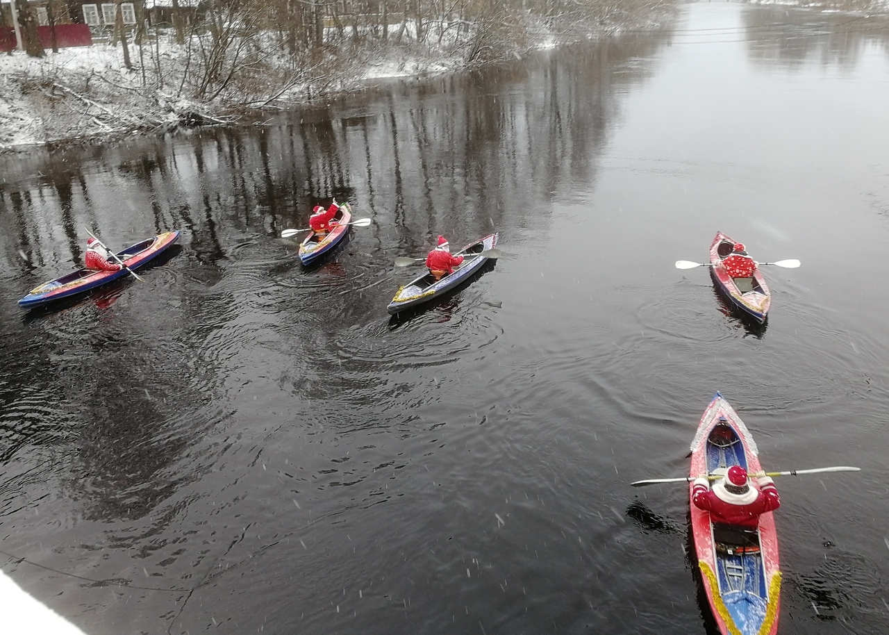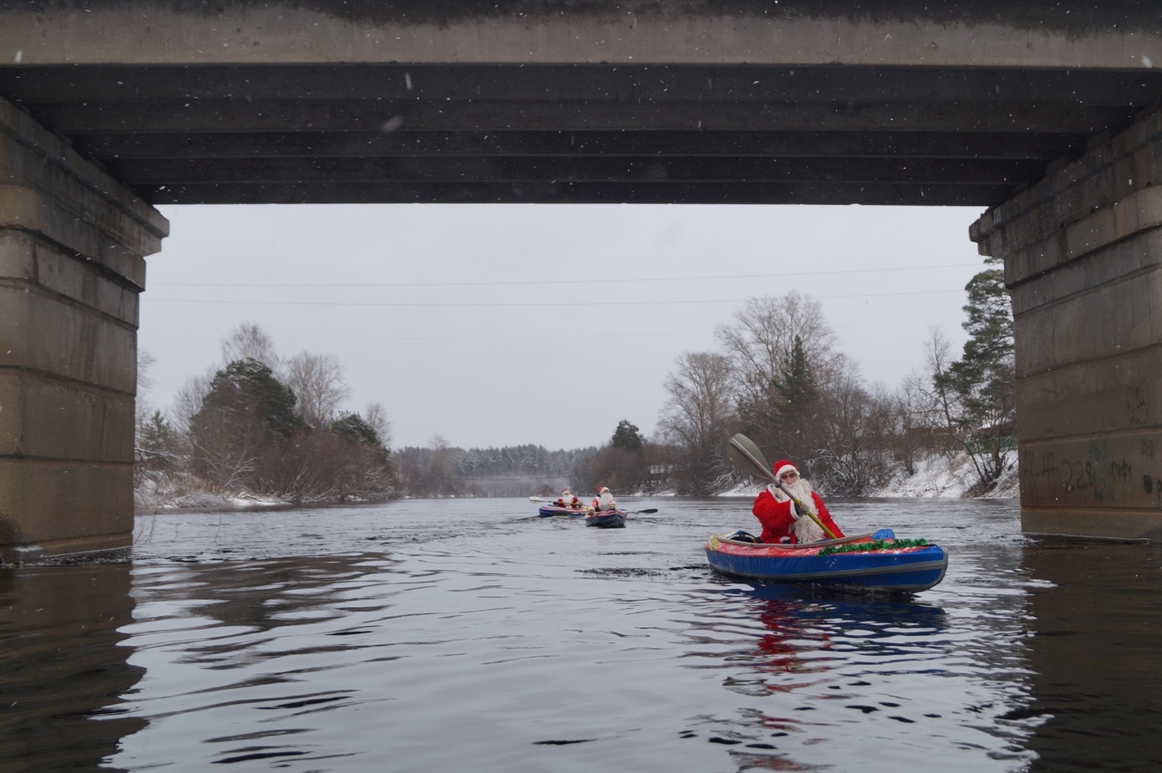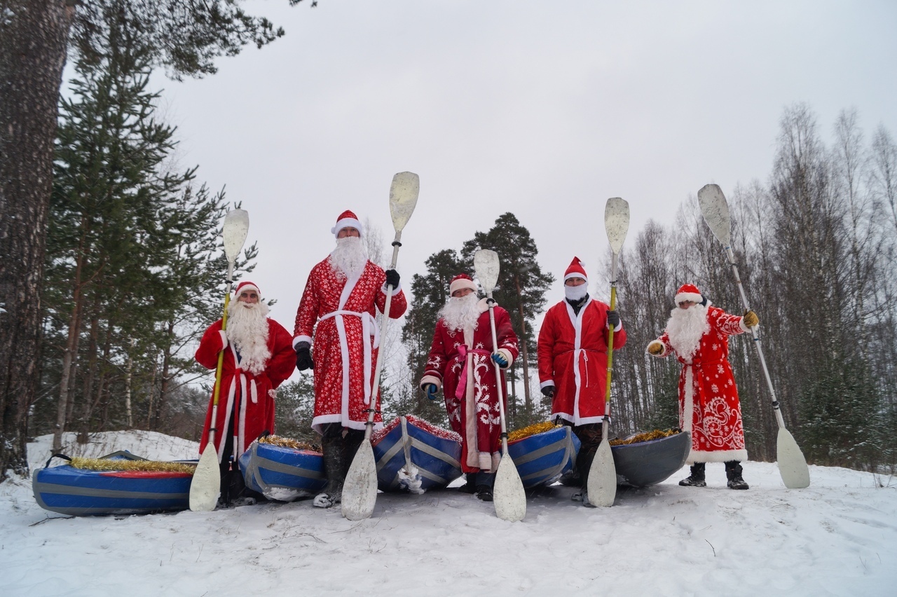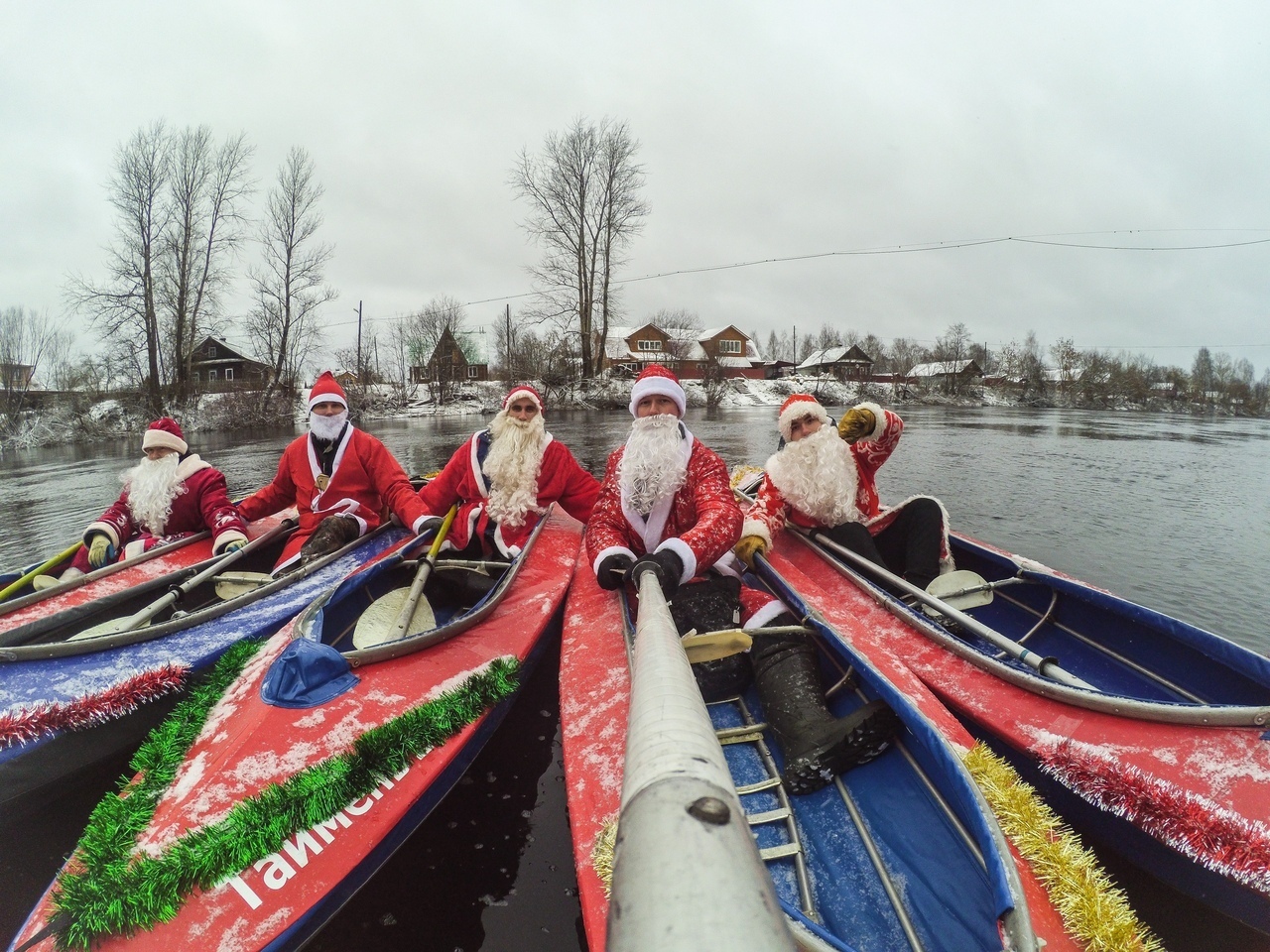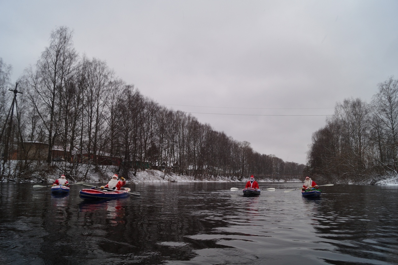 Мужчины переоделись в традиционные костюмы Дедов Морозов, но вместо привычных саней сели в каяки. Затем «волшебники» совершили, заплыв по реке Колпь. Появление пятёрки белобородых экстремалов вызывало настоящий восторг у всех, кто их встречал. Участники взяли с собой в лодки и сладости. Ими они делились со всеми детьми, которых встречали по ходу маршрута.