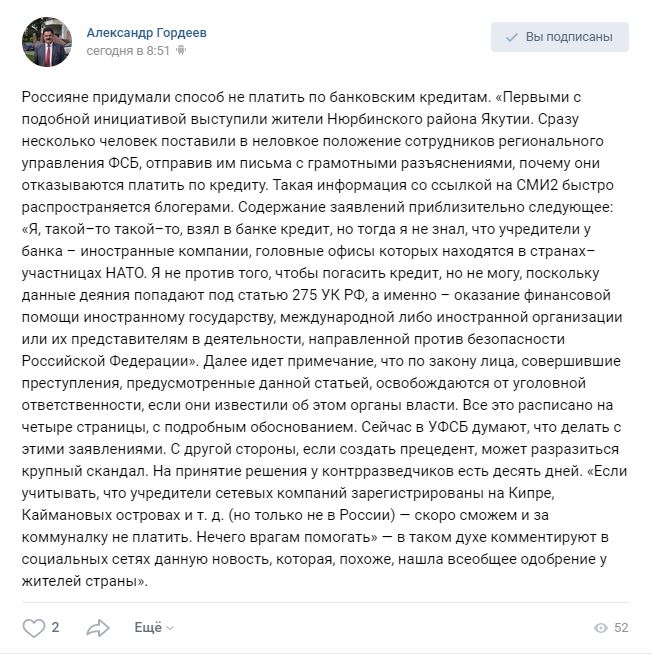 Парламентарий, видимо, решил стать ещё ближе к народу и поделился опытом того, как можно не платить за кредит, взятый в банке, имеющем иностранное происхождение. Опыт этот, конечно же, не личный. В письме указано, что прецедент был создан на территории Якутии. Впрочем, его можно легко перенести и в вологодские реалии.