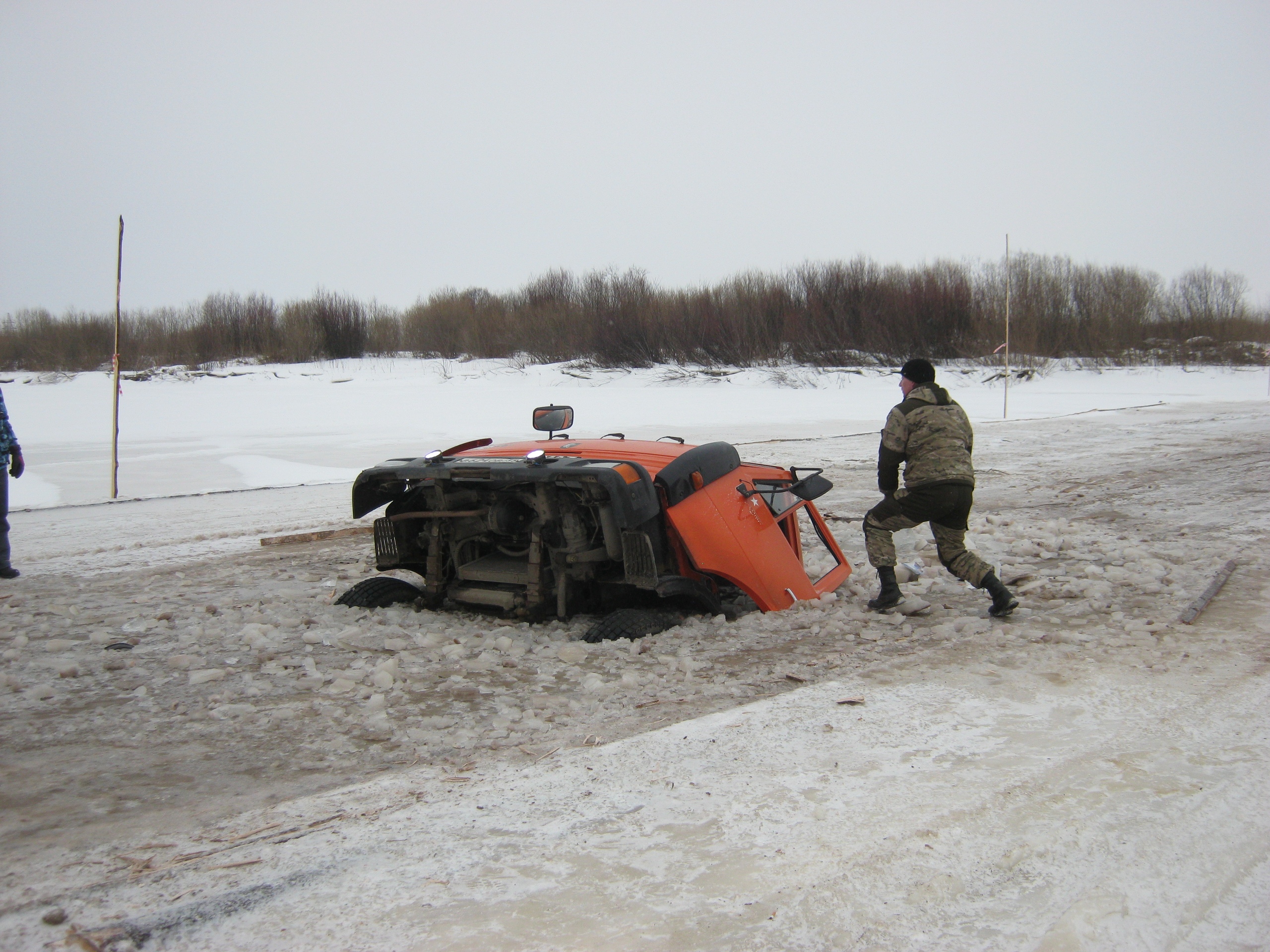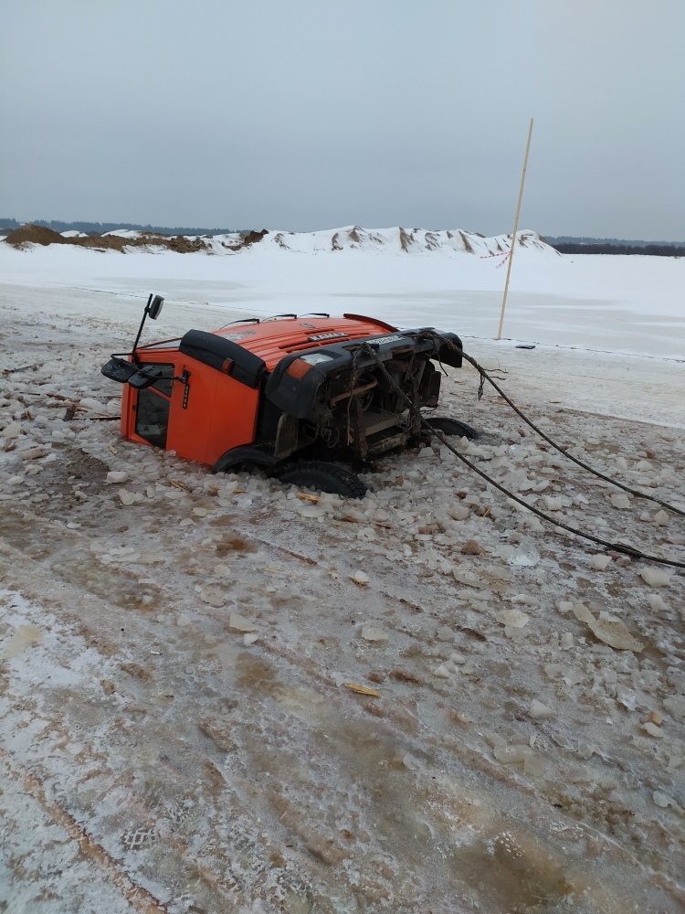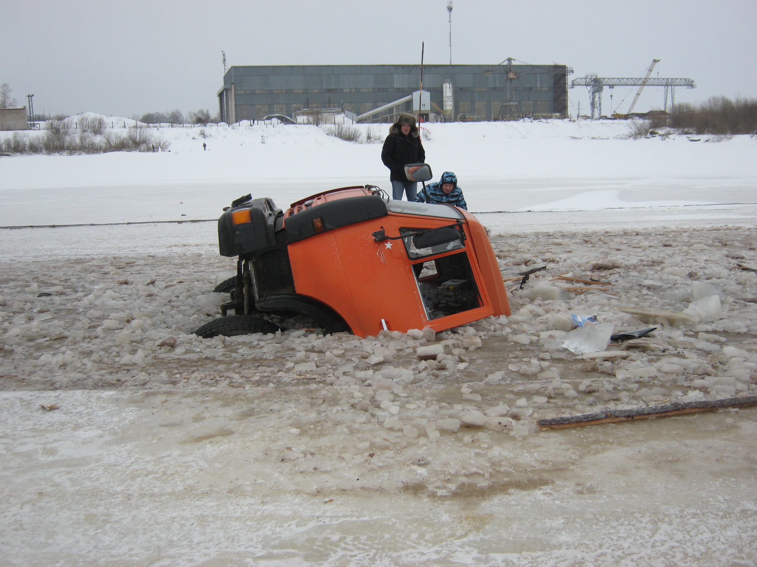 Серьёзное происшествие случилось накануне в 15:30 на ледовой переправе «679 км. Полой Рязаниха» на Северной Двине. Под лёд провалился гружёный песком КамАЗ. Водитель, к счастью, успел выскочить из кабины и не пострадал.