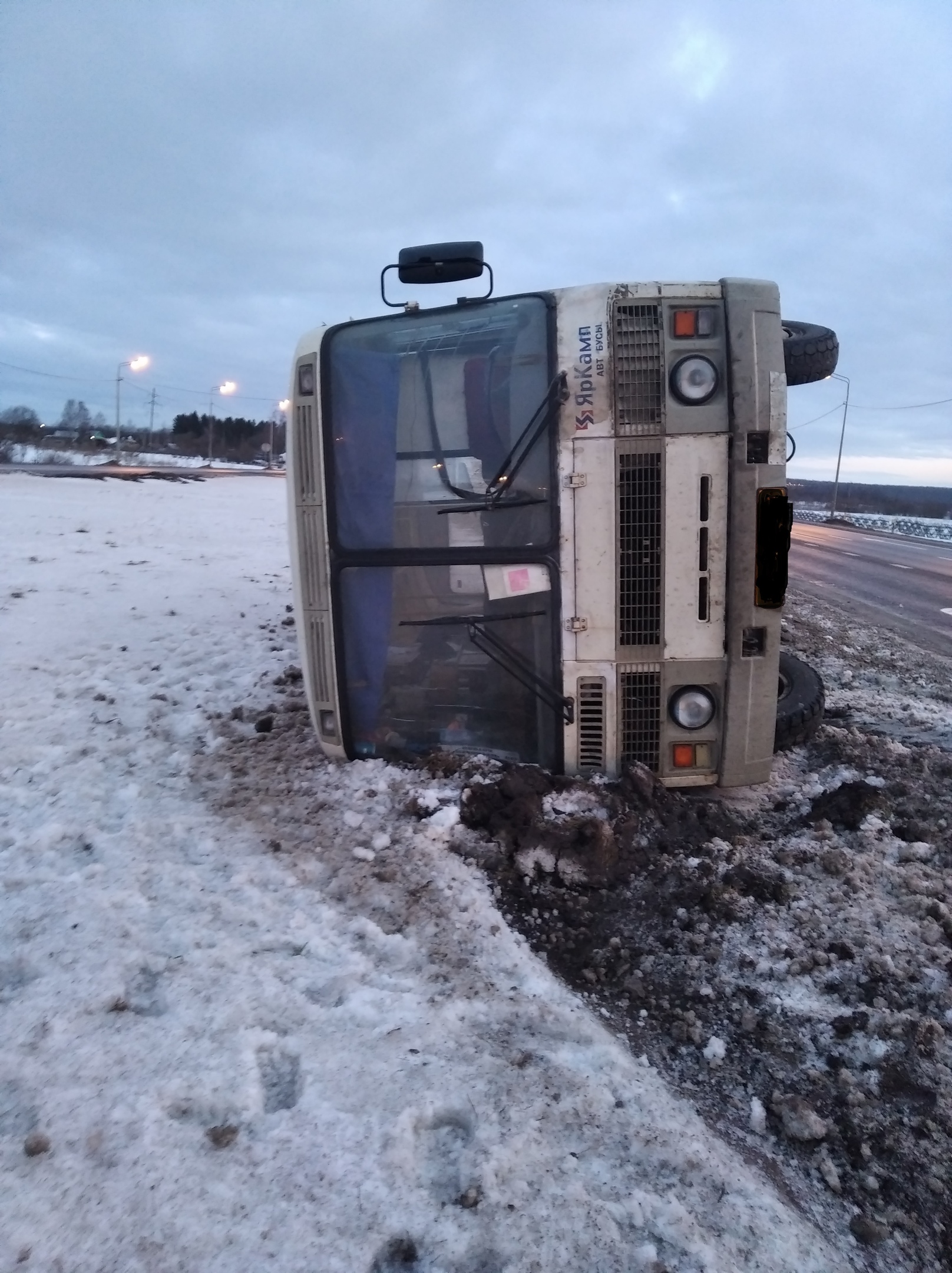 По предварительной информации, водитель автобуса ПАЗ не справился с управлением. Машину занесло и опрокинуло на левый борт. По счастливой случайности внутри салона не было ни пассажиров, ни кондуктора. Водитель смог сам выбраться из кабины и позвонил в службу спасения.