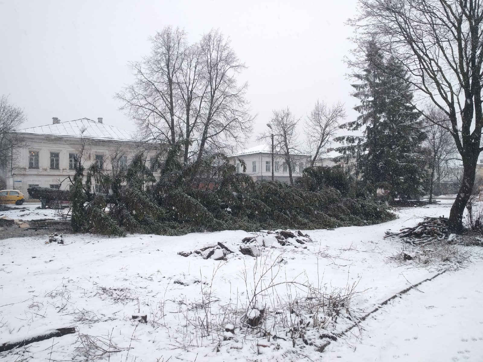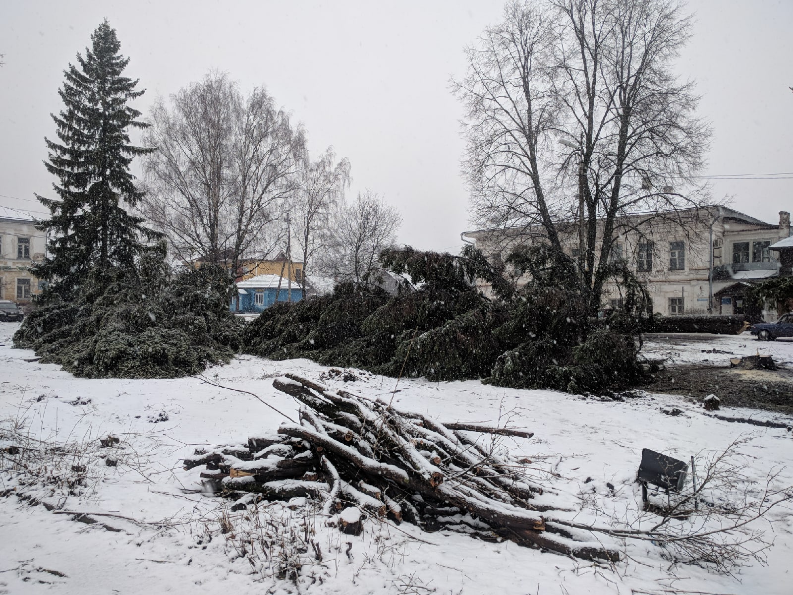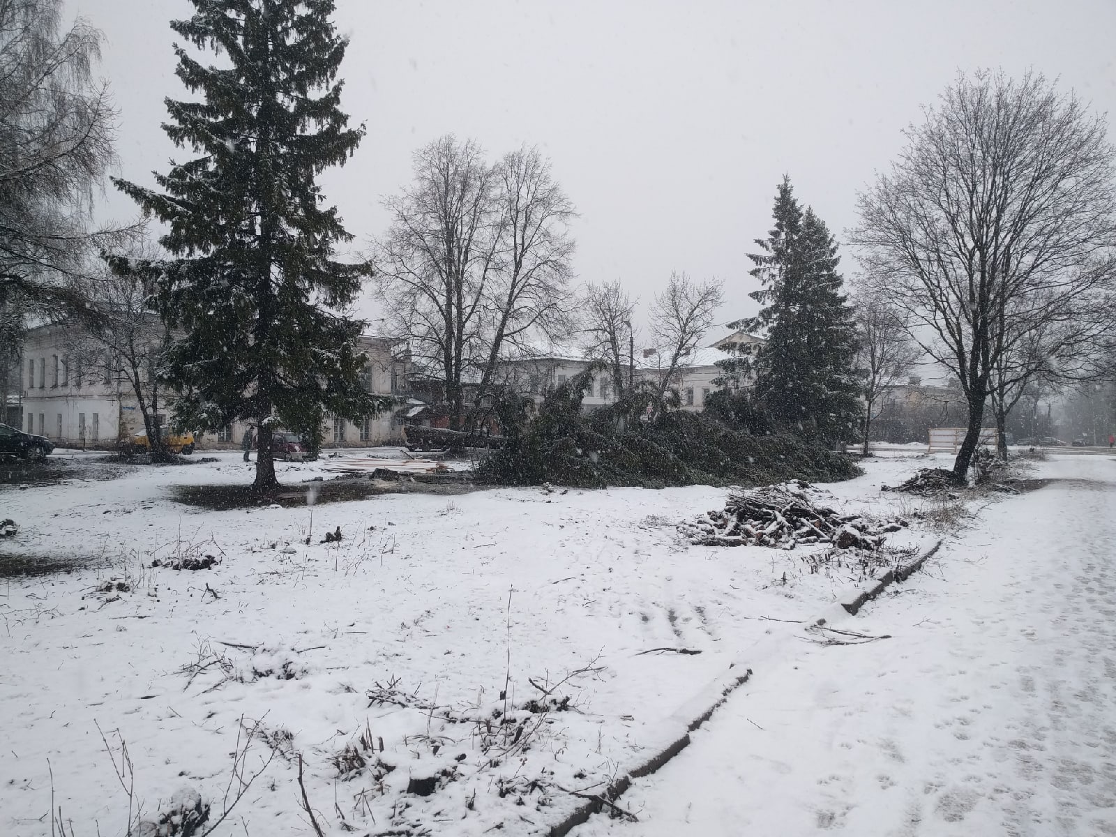 Вместе с сухостоем и уборкой площади, местные коммунальщики спилили несколько многолетних елей, украшавших зелёную зону.