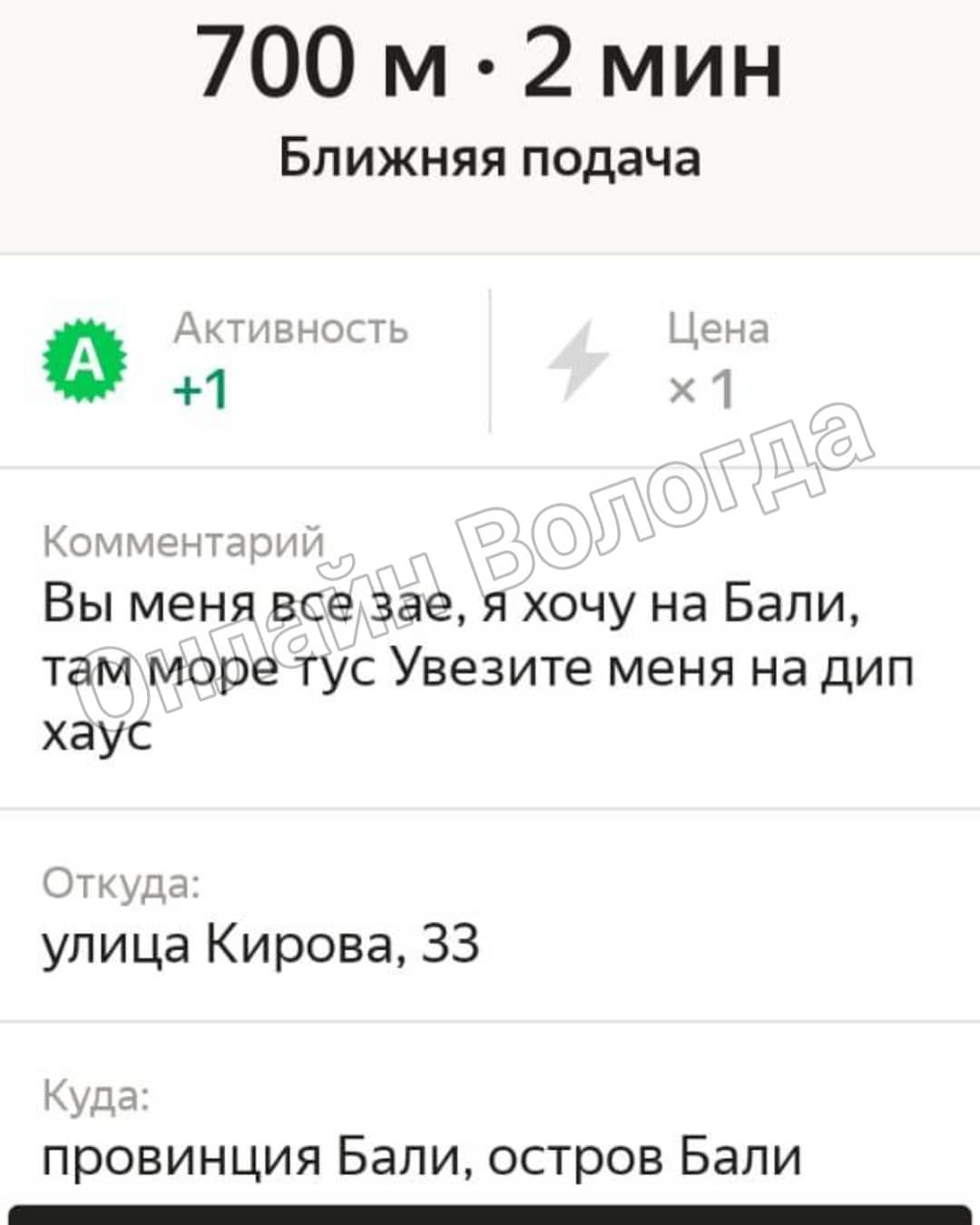 Живущий на ул. Кирова заказчик, используя не самые цензурные выражения, просит увезти его на остров Бали. Он мотивирует это тем, что ему все надоели. Цель поездки – участие в одном из музыкальных фестивалей.