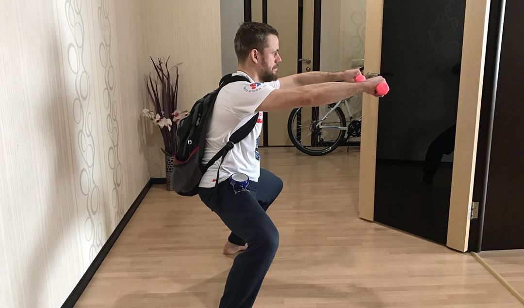 На этот раз спортсмен больше 7 минут простоял в стойке «всадника», имея на себе 17-килограммовые утяжелители.