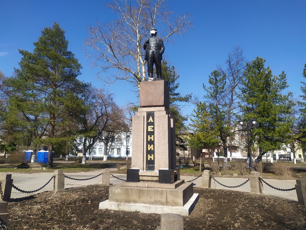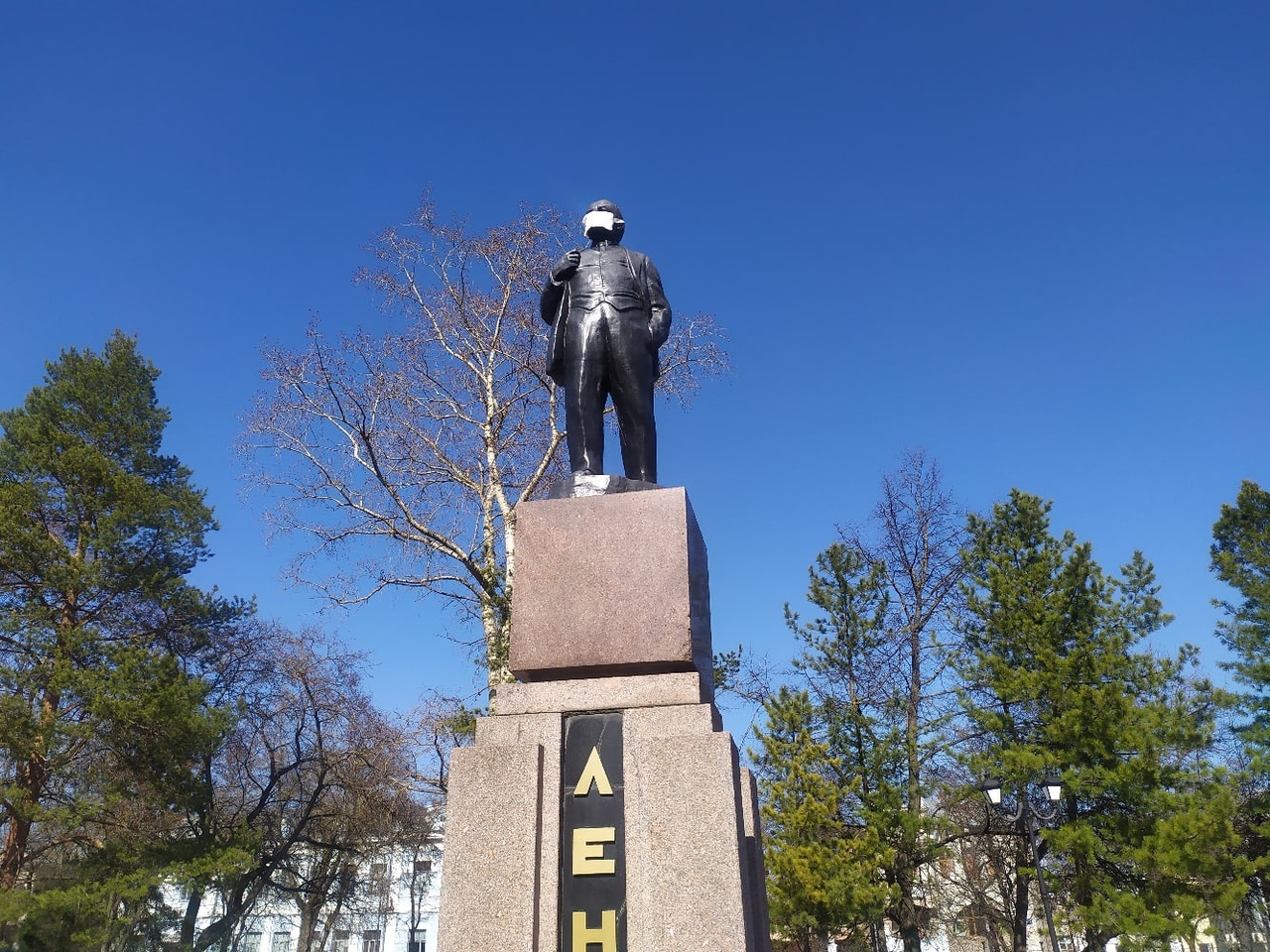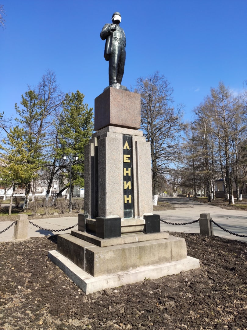 Теперь монумент вождю, равно как и вологжане, соблюдает масочный режим. На лицевую часть статуи акционисты надели марлевую повязку.