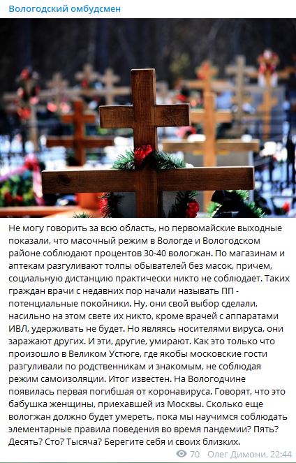 Около 60% жителей Вологды и района, по мнению омбудсмена, не соблюдают никаких мер предосторожности. Люди перестали носить маски в общественных местах. Также они игнорируют социальную дистанцию. Именно этих граждан уполномоченный и ввёл в категорию ПП – потенциальных покойников. Спасти их смогут только врачи и аппараты ИВЛ.