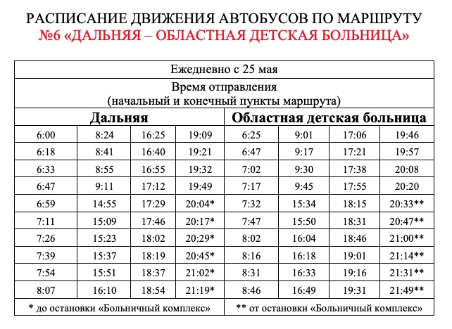 Автобус № 6 ездит по обновлённому расписанию с 25 мая. До остановочного пункта «Больничный комплекс» транспорт курсирует после 20.00. В течение всего дня средний промежуток маршрута на линии составляет 15 минут.