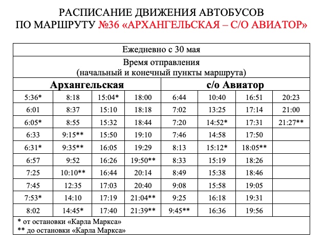 Автобусный маршрут №36 «Архангельская - с/о Авиатор» начал ездить по изменённому расписанию с 30 мая.