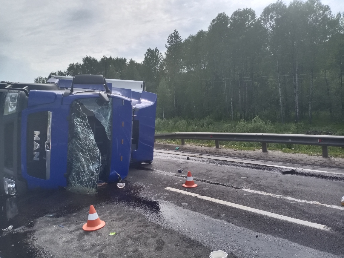UPD: Согласно обновлённой информации, грузовик MAN обгонял попутную «Газель». Во время манёвра водитель фуры не смог справиться с управлением - огромную машину на скорости занесло и опрокинуло на правый борт. Пострадали 2 человека - сам дальнобойщик и его пассажир - пожилой мужчина 1954 г.р. Последний с серьёзной черепно-мозговой травмой был доставлен в реанимацию. Жизни водителя ничего не угрожает. Попутную «Газель» большегруз не задел, - сообщает пресс-служба региональной полиции.