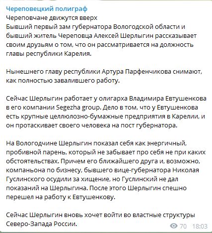 В ближайшем будущем он может попрощаться с карьерой в оборонной промышленности и вновь уйти в политику. Правда, возвращаться в свой родной регион он не будет. Кандидатуру Шерлыгина рассматривают на пост будущего главы Карелии. Как и Вологодская область, она входит в состав СЗФО. Пока ещё действующий руководитель республики – Артур Парфёнчиков – сложит свои полномочия в ближайшее время. О возможных кадровых перестановках во власти сообщил телеграм-канал «Череповецкий Полиграф», ссылаясь на слова самого Алексея Шерлыгина.