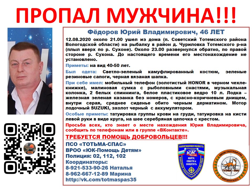Последний раз мужчину видели 12 августа. Он ушел из посёлка Советский около 21 часа. Тотьмич сел в лодку и поплыл по Сухоне вверх по течению. Около 23:00 он отправился в обратную сторону, чтобы приплыть к ночи домой. Однако мужчина так и не вернулся. Родственники пропавшего обратились в экстренные службы.