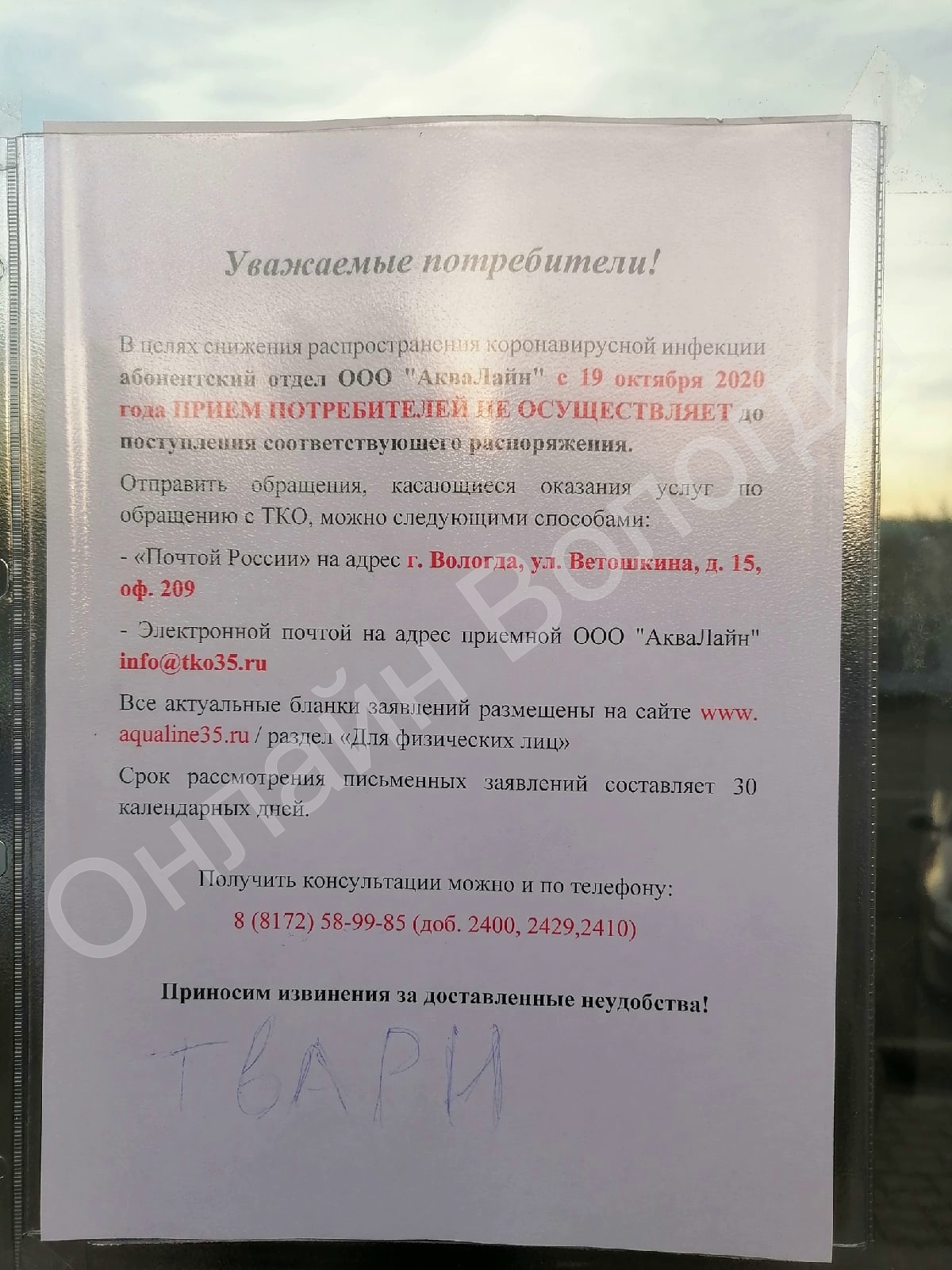 Сначала «АкваЛайн» позакрывал все свои офисы в регионах. Центральный – в Вологде – работал лишь до недавних пор. Ссылаясь на коронавирусную пандемию, регоператор закрыл свои двери для посетителей и перешёл на дистанционный режим. И почти сразу посыпались жалобы. Во-первых, люди элементарно не могут дозвониться в контору и им вынужденно приходиться туда ехать. Во-вторых, клиенты сетуют на некомпетентность сотрудников, ссылаясь на то, что им не могут дать адекватной консультации по тому ли иному вопросу. Соответствующий отзыв появился сегодня в одном из популярных городских сообществ.