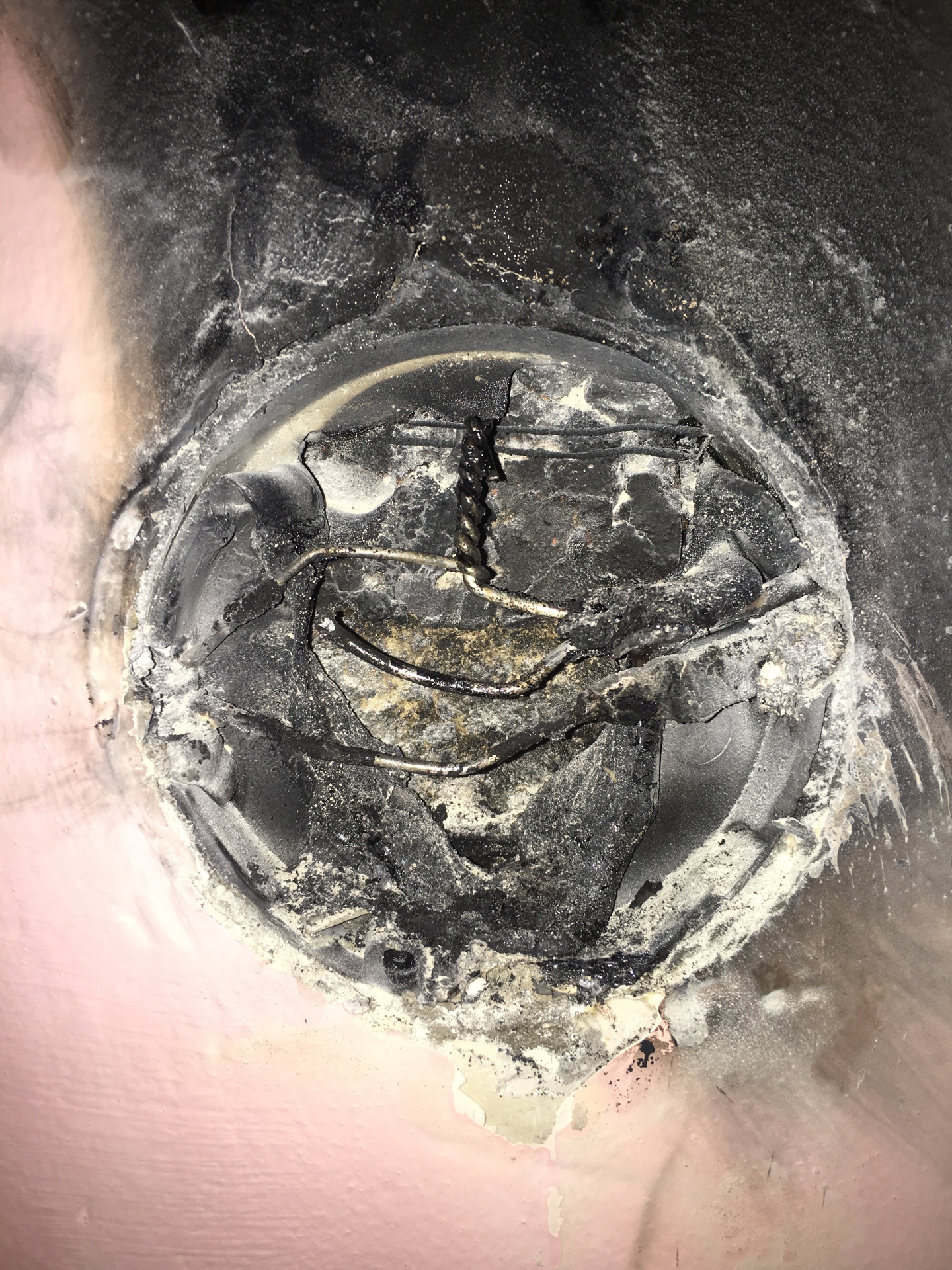 Огонь повредил изоляцию алюминиевых проводников в распределительной коробке. Также закопчена внутренняя отделка на стене.