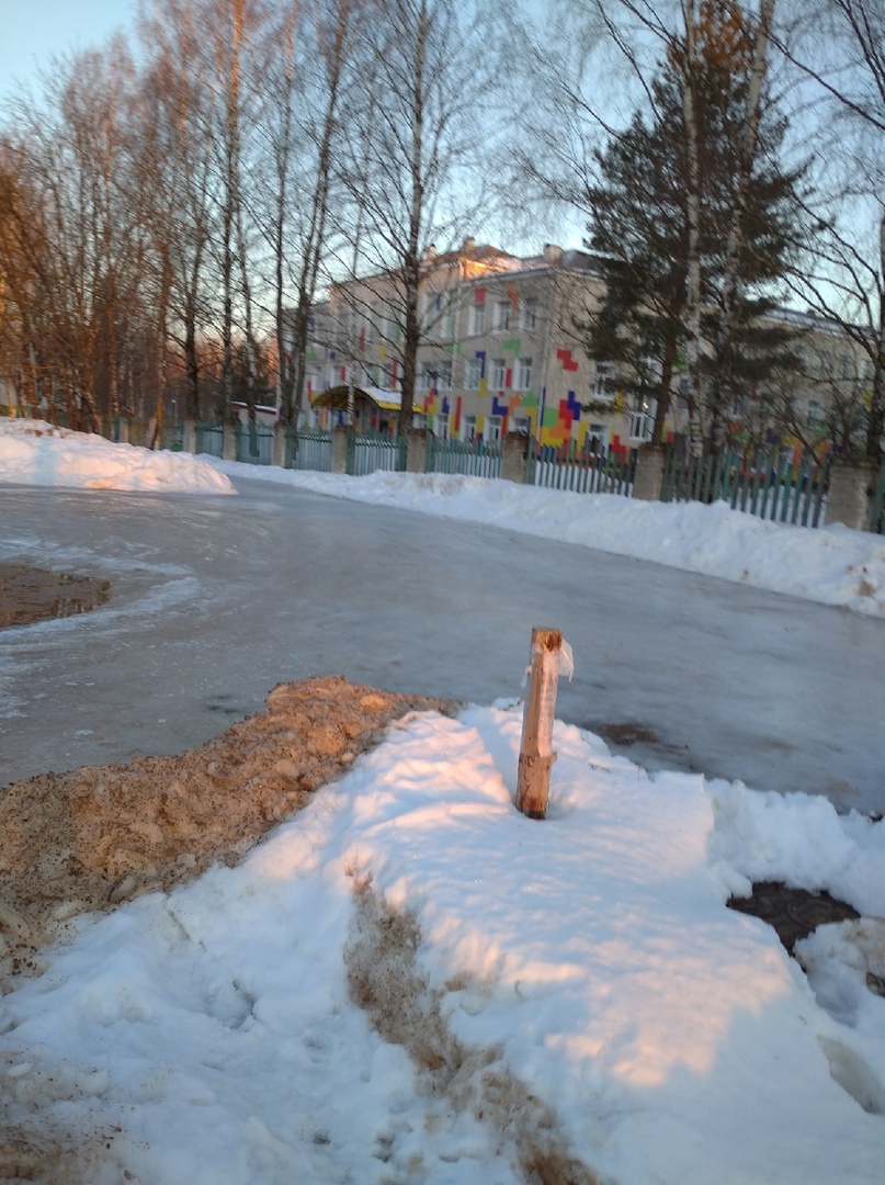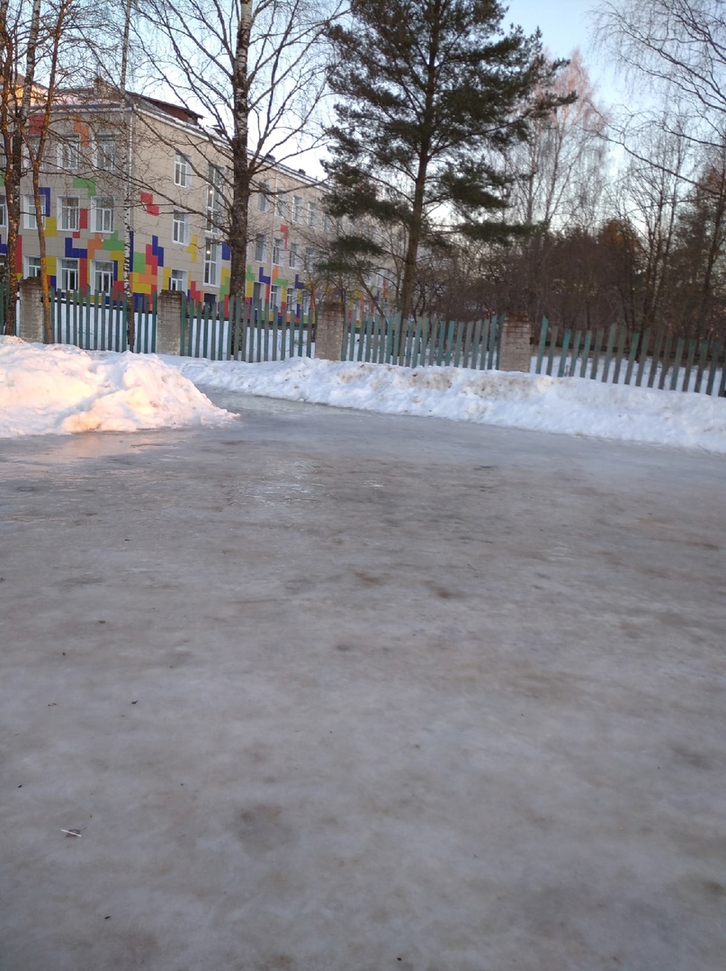 Из-за резких перепадов температуры участок дороги рядом с местной школой покрылся льдом. Подобная ситуация небезопасна как для пешеходов, так и для автотранспорта. Дети вынуждены каждый день по пути на учёбу преодолевать страшный каток, рискуя поскользнуться и упасть. Кроме того, наледь на дороге мешает нормальной высадке учеников из школьного автобуса.