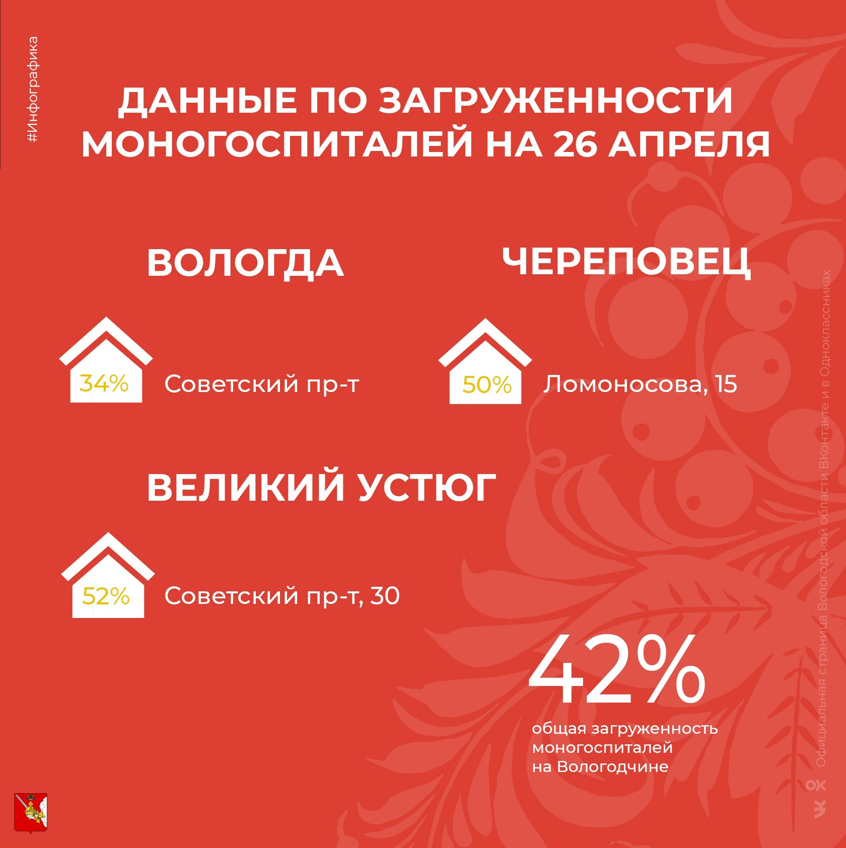 К сожалению, число погибших вновь возросло. За 25 апреля с подтверждённым COVID-19 скончались 4 вологжанина. Общее количество погибших с этим диагнозом – 986 пациентов вологодских медучреждений. Статистика предоставлена официальным порталом стопкоронавирус.рф. Сегодня общая загруженность моногоспиталей Вологды, Череповца и Великого Устюга составляет 42%.