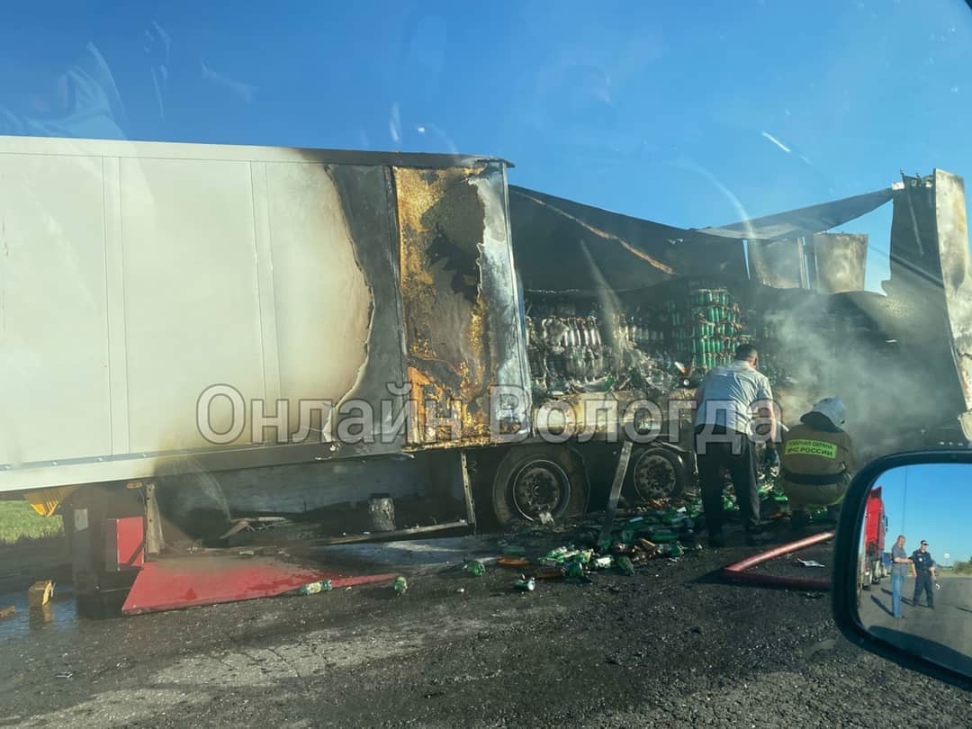 Товарный большегруз двигался по трассе. В какой-то момент машина загорелась. Водитель остановился и вызвал пожарных. Полностью спасти товар не удалось. Значительная часть перевозимых продуктов повредилась огнём. Полный ущерб предстоит оценить экспертам.