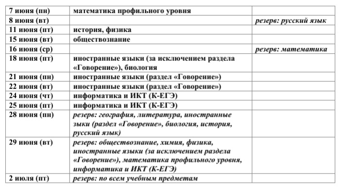 31 мая (пн) география, литература, химия; 3 июня (чт) русский язык; 4 июня (пт) русский язык; 7 июня (пн) математика профильного уровня; 11 июня (пт) история, физика; 15 июня (вт) обществознание; 18 июня (пт) иностранные языки (за исключением раздела «Говорение»), биология; 21 июня (пн) иностранные языки (раздел «Говорение»); 22 июня (вт) иностранные языки (раздел «Говорение»); 24 июня (чт) информатика и ИКТ (К-ЕГЭ); 25 июня (пт) информатика и ИКТ (К-ЕГЭ).
