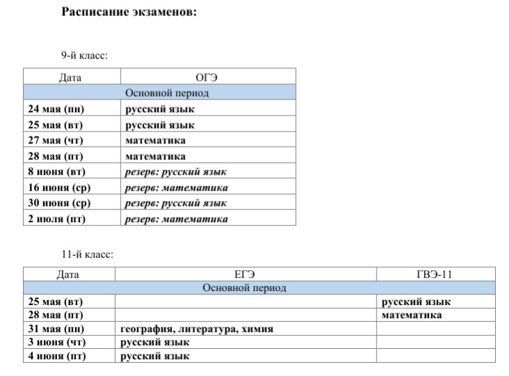 25 мая (вт) русский язык; 28 мая (пт) математика.