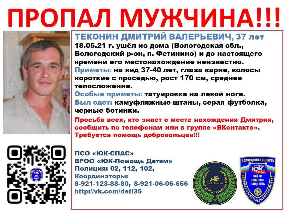 Второй мужчина зарегистрирован по месту жительства в посёлке Фетинино. Жителя Вологодского района не видели с 18 мая. По информации близких мужчины, 37-летний пропавший ушёл из дома в камуфляжных штанах, серой футболке и чёрных ботинках. Известно, что у Теконина Дмитрия Валерьевича есть татуировка на левой ноге. У гражданина короткие волосы с проседью, карие глаза, среднее телосложение и рост порядка 170 см.