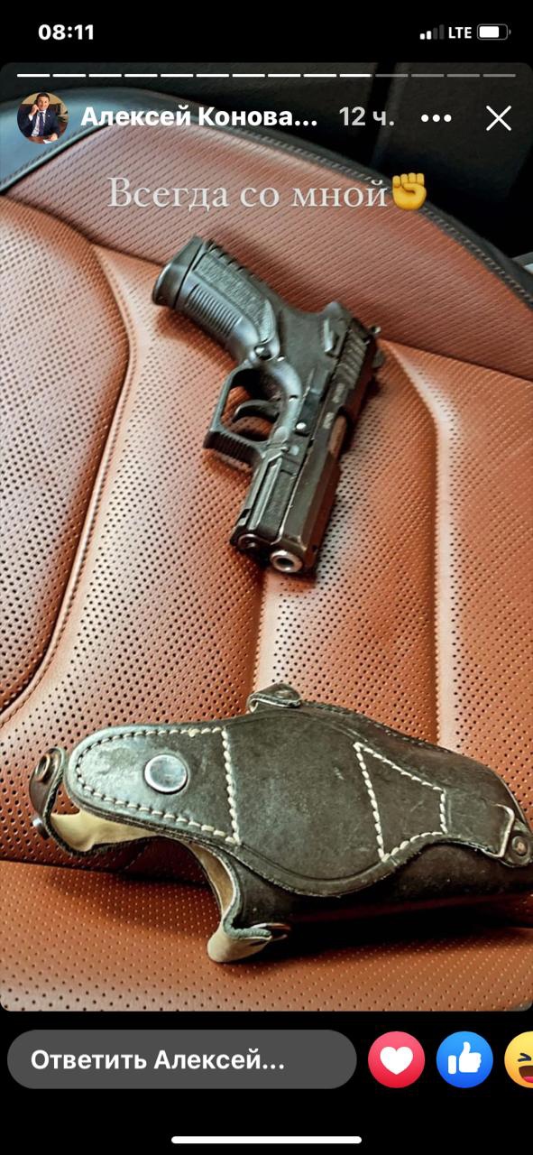 На своей личной странице Коновалов выложил пост-сторис с фотографией своего (предположительно) травматического пистолета. Оружие без кобуры лежало на сидении автомобиля. Снимок сопровождала надпись «Всегда со мной» и эмоджи в виде сжатого кулака.