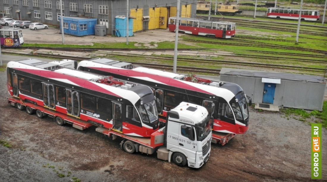 Пока в город доставили два трамвая. Их привезли сегодня ночью и сейчас они находятся в депо. Скоро транспорт разгрузят и поставят на колёса.