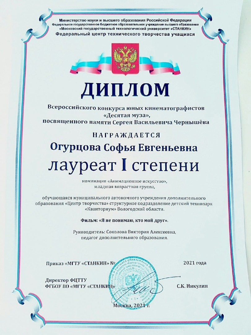 Софья Огурцова, воспитанница детского технопарка «Кванториум» в Вологде, стала лауреатом I степени Всероссийского конкурса юных кинематографистов «Десятая муза». Девочка под чутким руководством наставника Виктории Соколовой, создала мультфильм «Я не понимаю, кто мой друг».