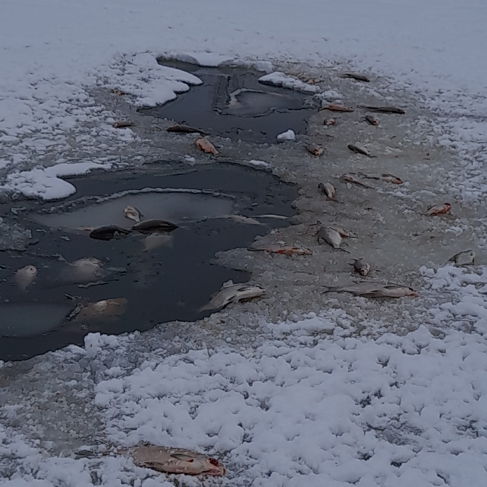 Автор поста рассказал, что большое количество погибшей рыбы обнаружено между Баранково и Лиминским. На фотографии, которой поделился рыбак, видно, что несколько десятков мертвых рыб лежит возле полыньи.