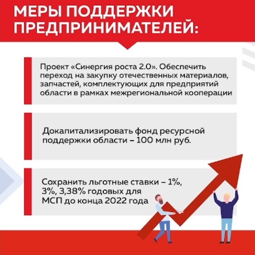 Сейчас одной из главных задач является импортозамещение. Вместе с тем глава региона отметил, что санкции дадут хороший толчок к развитию собственных производств. В настоящее время проводятся регулярные консультации с бизнесом. Собранная информация помогает в выработке решений по антикризисным мерам. Так, рекомендовано вовлечь как можно больше предприятий в проект «Синергия роста 2.0», докапитализировать Фонд развития промышленности региона на 300 миллионов рублей, оказать помощь в поиске контрагентов и новых рынков сбыта.