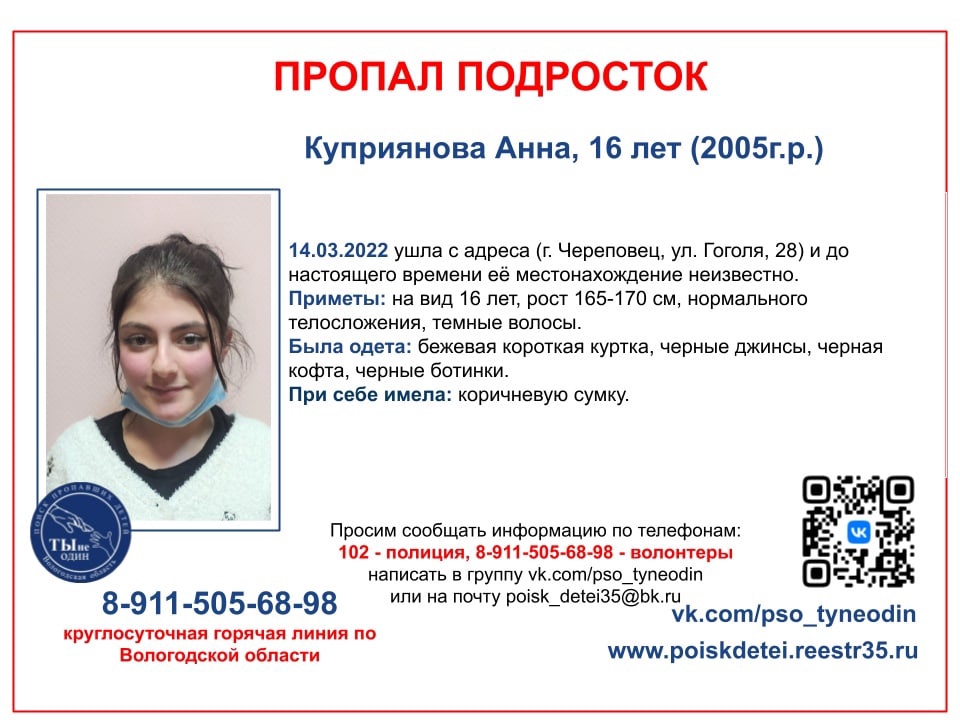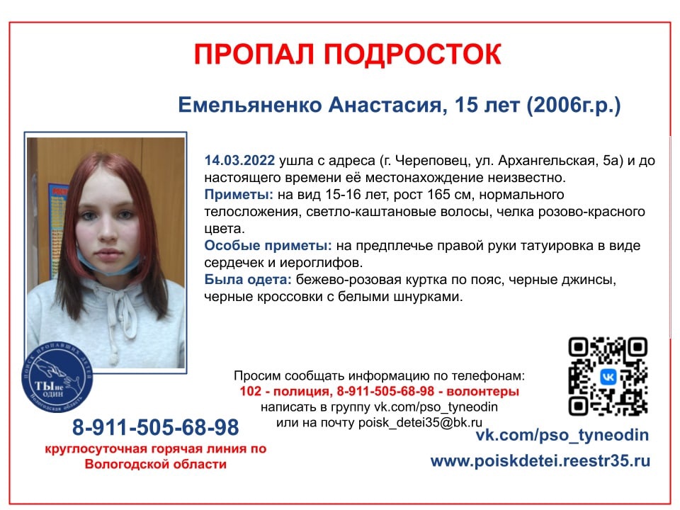Спутницам юного чероповчанина на вид также около 16. Анастасия была одета в короткую бежево-розовую куртку, чёрные джинсы и кроссовки. На правом предплечье у пропавшей татуировка в виде сердечек и иероглифов.