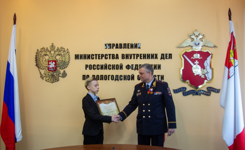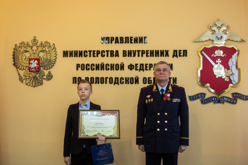 Вологодскую область в церемонии награждения представлял Андрей Чуканов. В августе прошлого года мальчик увидел, как в одном из магазинов на улице Пугачева ходит странный мужчина. Он «крутился» у автомата с игрушками. Уже через несколько минут Андрей встретил этого же мужчину на улице с целым пакетом призов. Мальчик понял, что за такой короткий промежуток времени нельзя было выиграть столько игрушек в автомате, поэтому решил сообщить о подозрительном факте полицейским. После этого мальчик вернулся на место происшествия и решил охранять разбитый автомат, что бы ни одна игрушка больше не была похищена.