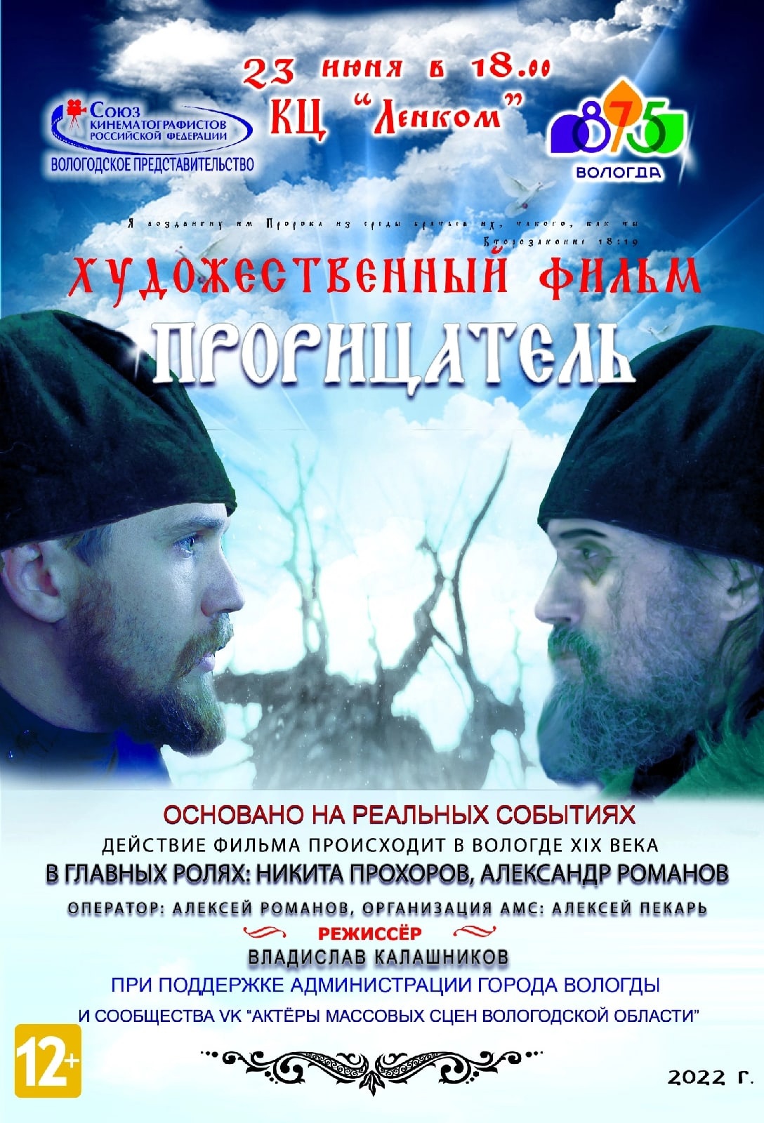 «Прорицатель». Картину также сняли в областном центре. Её производством занимались - режиссёр Владислав Калашников и оператор Алексей Романов. Сценарий написал Владислав Калашников при финансовой поддержке Министерства культуры РФ. Фильм рассказывает о диаконе Александре Воскресенском, жившем в Вологде в конце XIX - начале XX веков и, по воспоминаниям современников, обладал даром предвидения. В главных ролях - вологжане Никита Прохоров и Александр Романов. Всех остальных персонажей в кинокартине исполнили непрофессиональные актёры - около ста жителей города Вологды и Вологодской области. Фильм снимали в Вологодском кремле, Лазаревском храме, Горне-Успенском женском монастыре, в Кадникове, в вагоне-музее 1903 года на станции в Лосте, а также в этнографическом музее «Семёнково».