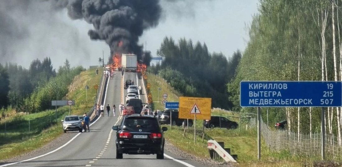 На 108 км трассы «Вологда - Медвежьегорск» водитель грузовика не справился с управлением и столкнулся сразу с семью легковыми автомобилями. Все машины охватил огонь. В результате ДТП погиб один человек, шестеро пострадали.