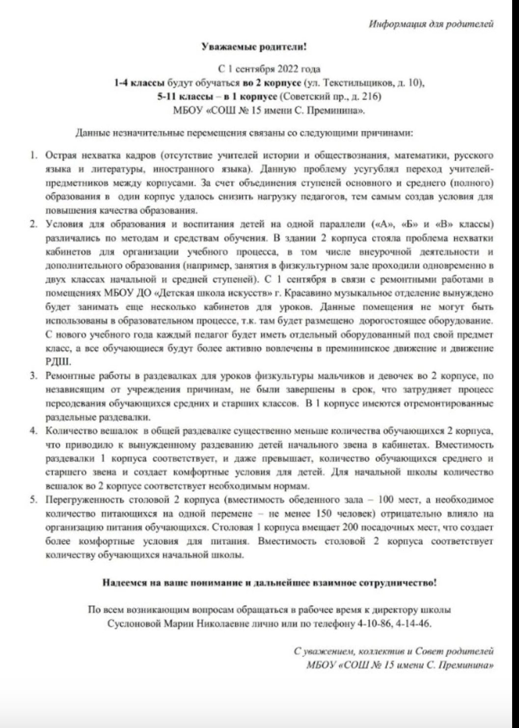 В местной «премининской» школе №15 нет учителей русского языка, литературы, математики, истории, иностранного языка и обществознания.