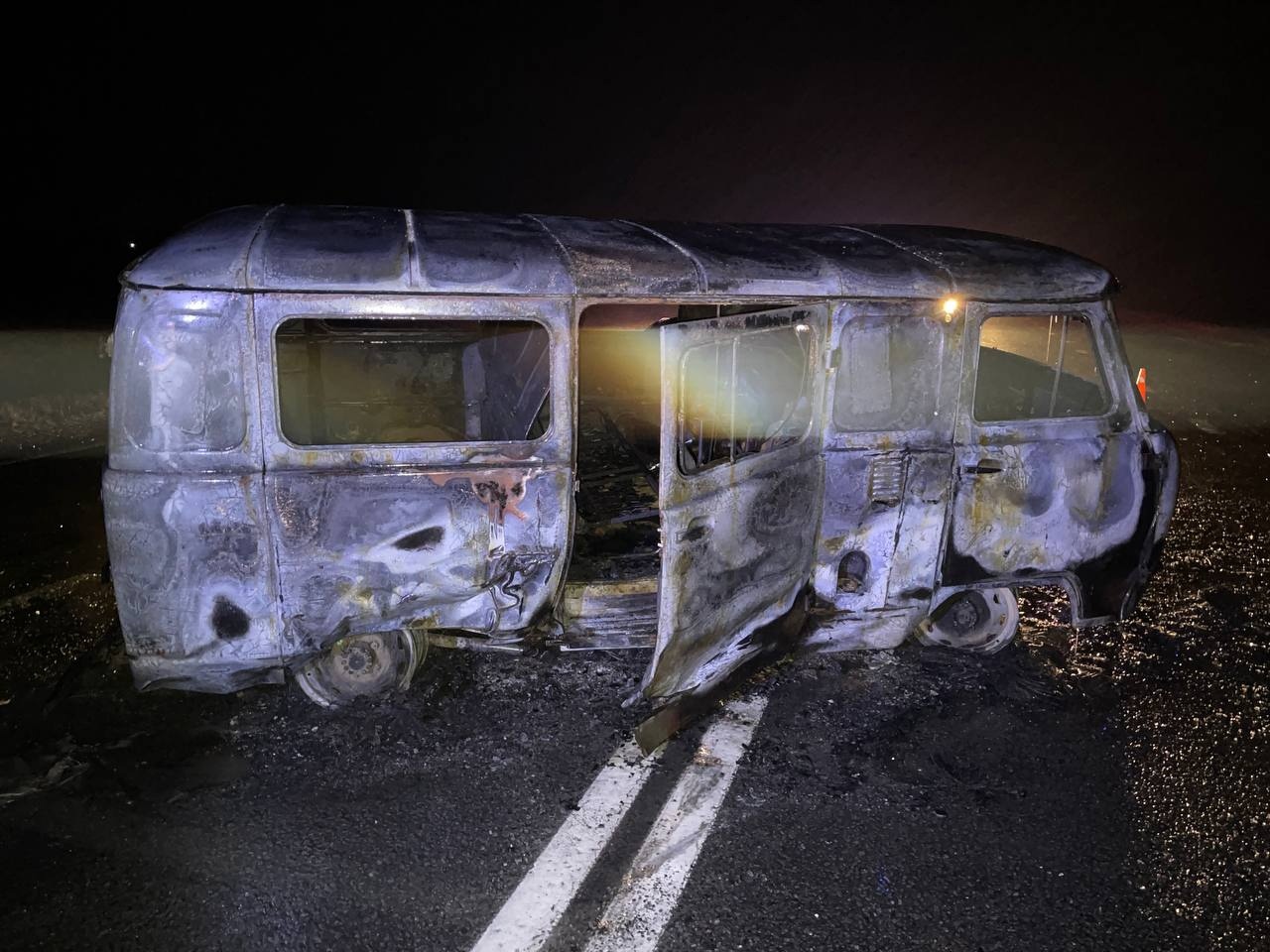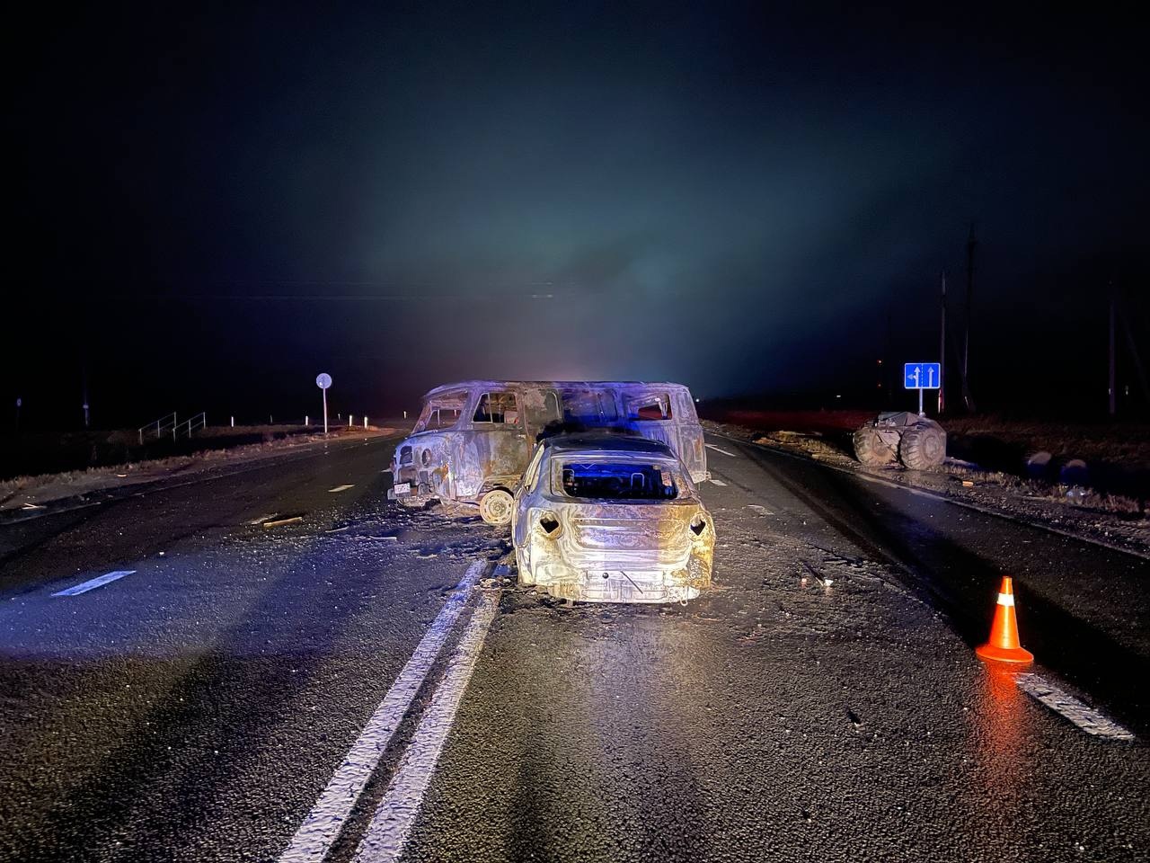В начале шестого 58-летний мужчина, управляя автомобилем «Лада Ларгус», ехал по трассе. По всей видимости, водитель не справился с управлением транспорта. В итоге «легковушка» столкнулась с УАЗом, за рулём которого находился 35-летний водитель. После удара «буханку» отбросила на встречную полосу. УАЗ врезался в «Ладу Гранту». Обе машины загорелись.