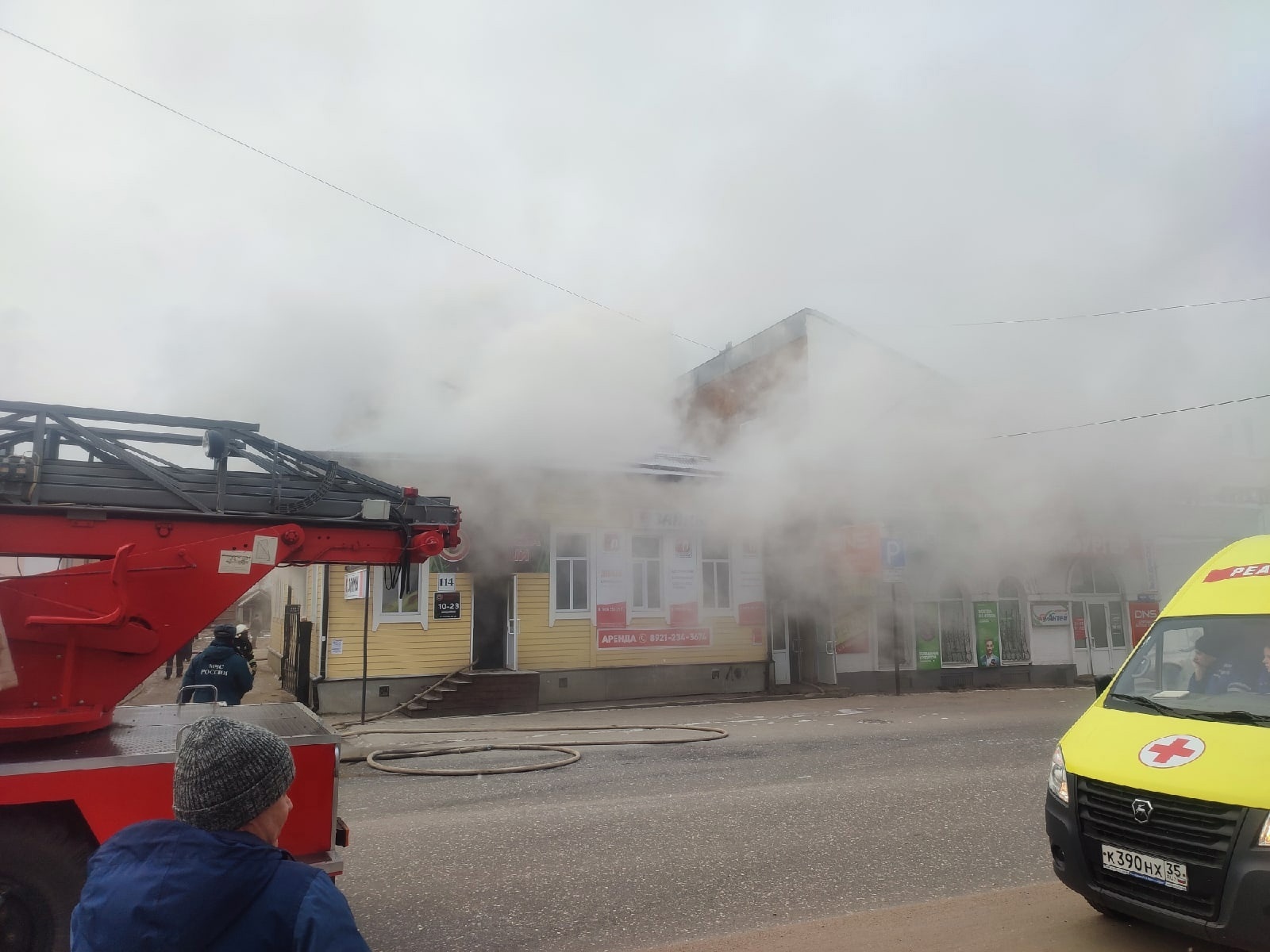 Само здание одноэтажное, деревянное. Снаружи постройка обшита сайдингом. Сейчас на пожаре работают несколько боевых расчётов спасателей. Также на месте происшествия находится реанимобиль. Улица временно перекрыта, - сообщает паблик местной администрации.
