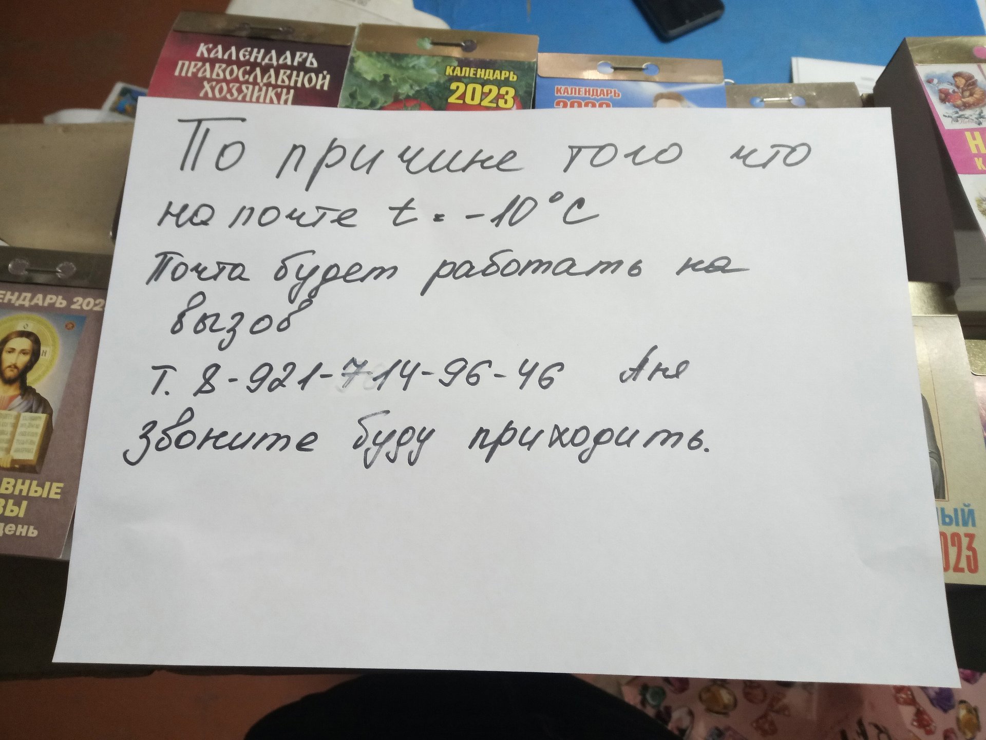 Находиться в помещении даже в верхней одежде невозможно. По этой причине местный почтальон Анна перешла на работу по вызову. В отделении висит объявление с её контактами и объяснением того, почему сама почта закрыта.