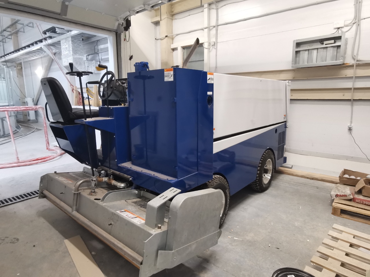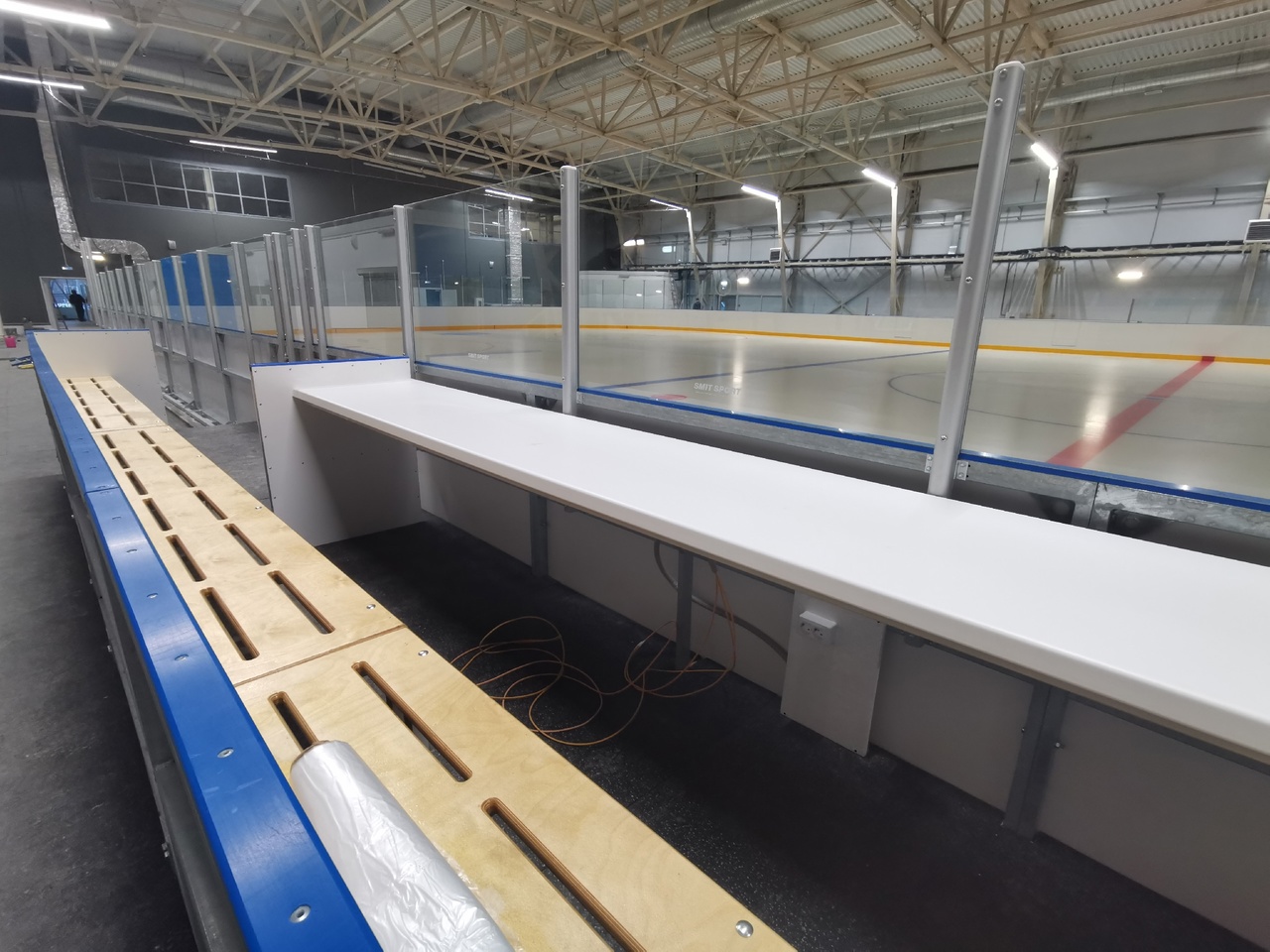 Специалисты уже полностью залили ледовую основу катка. Готовы к эксплуатации льдозаливочная машина и аппарат для подрезания кромки льда. Сейчас укладывается резиновое покрытие там, где это предусмотрено проектом. Установлен грузовой лифт, полностью завершён монтаж сантехнического оборудования в туалетах и душевых комнатах.