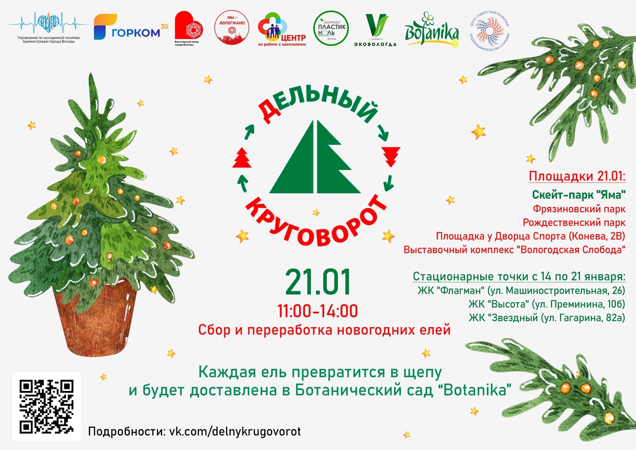 Основной день акции запланирован на 21 января. Тогда принести елку можно по 5 адресам: Скейт-парк «Яма», выставочный комплекс «Вологодская слобода», Фрязиновский парк, площадка у Дворца спорта (ул. Конева, 2в) и Рождественский парк. Вместе с тем, организуют работу и 3 стационарных точек сбора: на улицах Машиностроительная, 26, Сергея Преминина, 10 «Б» и Гагарина 82 «А». Здесь будут ждать вологжан с 14 по 21 января, сообщают организаторы проекта.