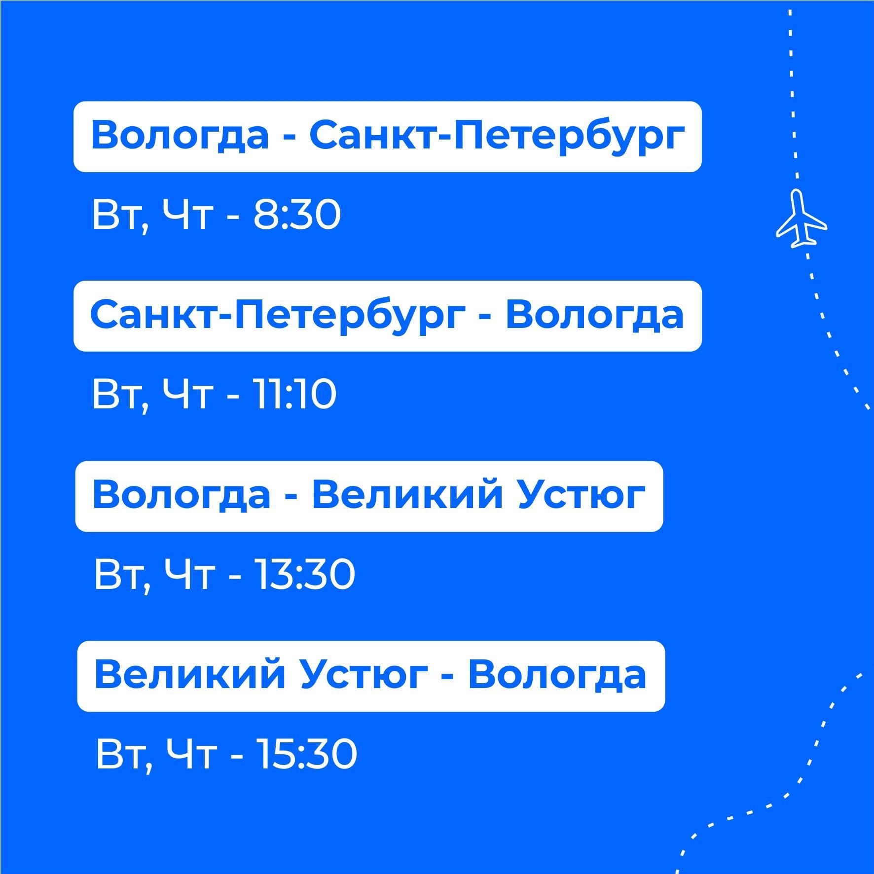 В Санкт-Петербург, напротив, самолёты из Вологды летают по чётным будним дням. Рейсы запланированы на 08:30. Обратные вылеты – в эти же дни, в 11:10.