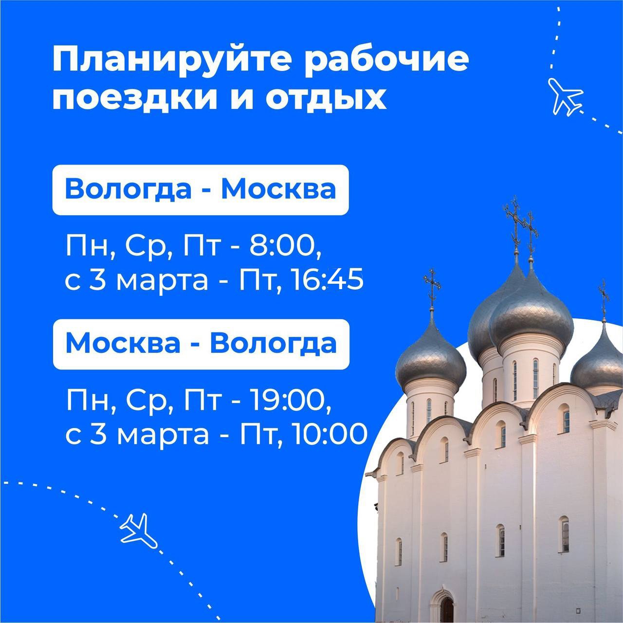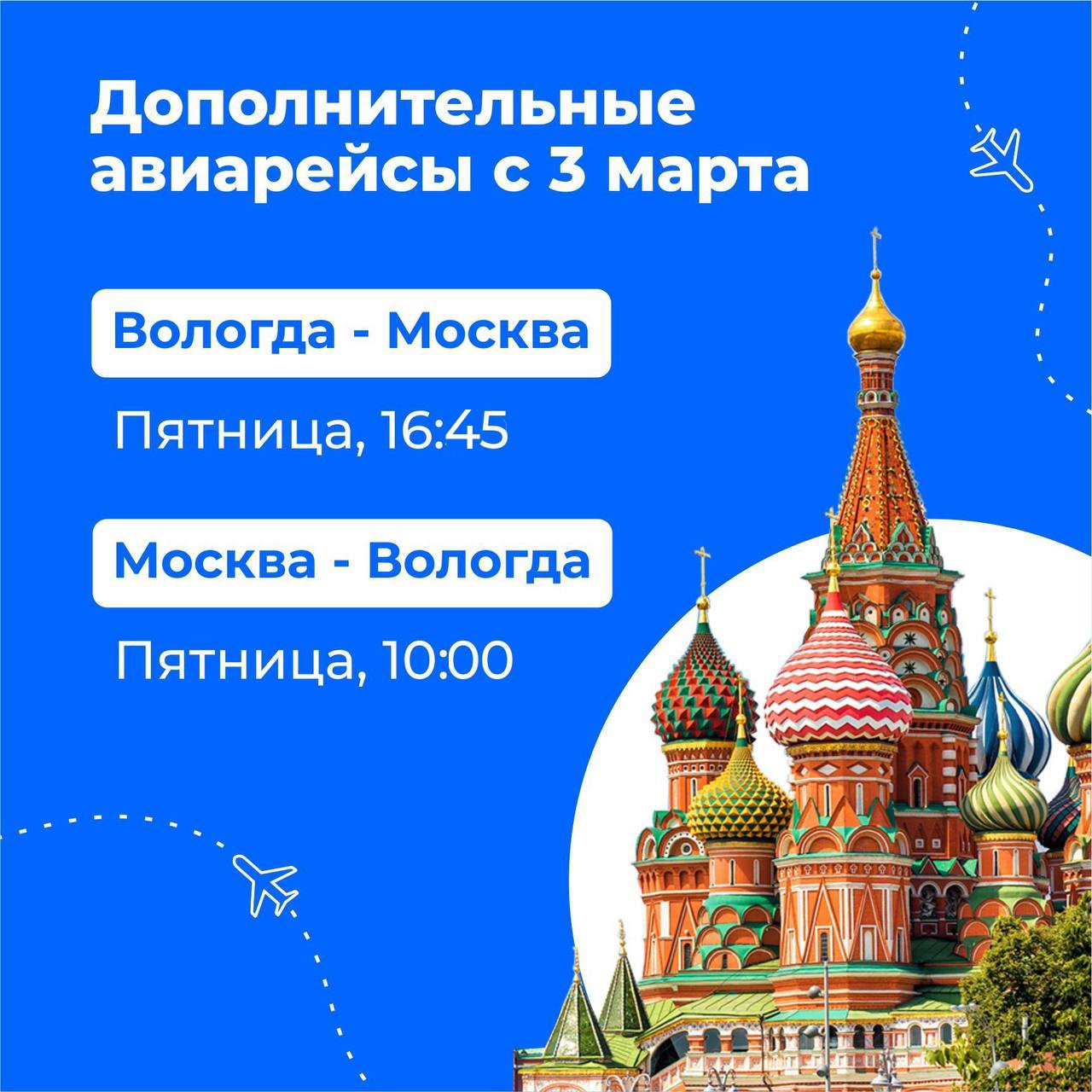 С 3 марта по московскому направлению, помимо привычных утренних вылетов в 08:00 (по нечётным будним дням), добавится ещё один – пятничный, в 16:30. Обратный рейс – также в пятницу, в 19:20. Время привычных регулярных вылетов в Вологду сохраняется.