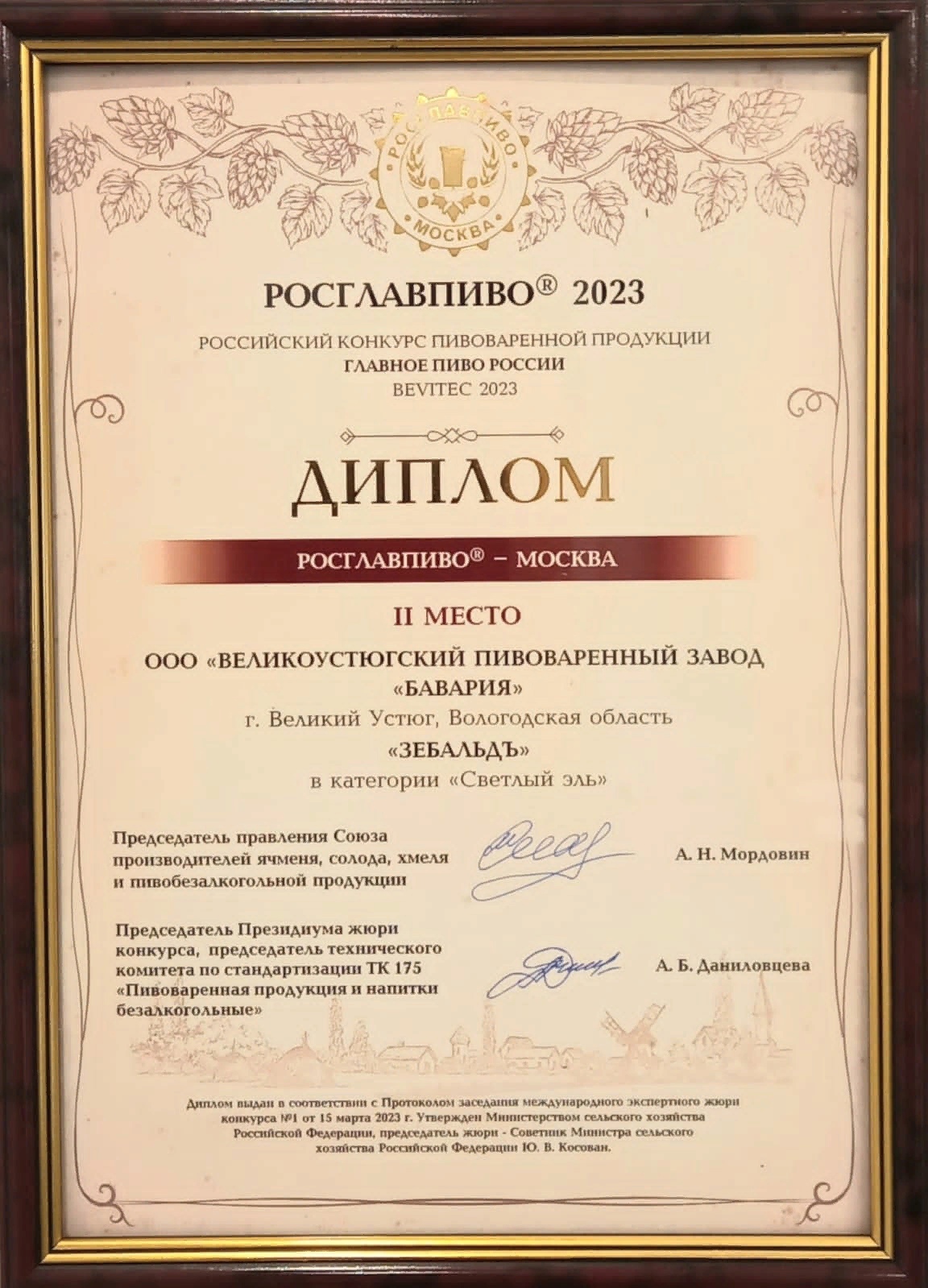 В рамках VI Всероссийского конкурса «Росглавпиво – главное пиво России» дегустация пивной продукции длилась в течение двух дней, 2 и 3 марта. Состязания проводились в комплексе зданий Российского биотехнологического университета (РОСБИОТЕХ). Международное жюри, в состав которого вошёл 31 эксперт, произвело оценку 502 образцов от 163 пивоваренных компаний. Минсельхоз России утвердил итоги конкурса. Серебряную медаль вручили Великоустюгскому заводу «Бавария» за пиво «Зебальдъ» в категории «Светлый эль». Награждение состоялось 28 марта на площадке выставочного центра ВДНХ.