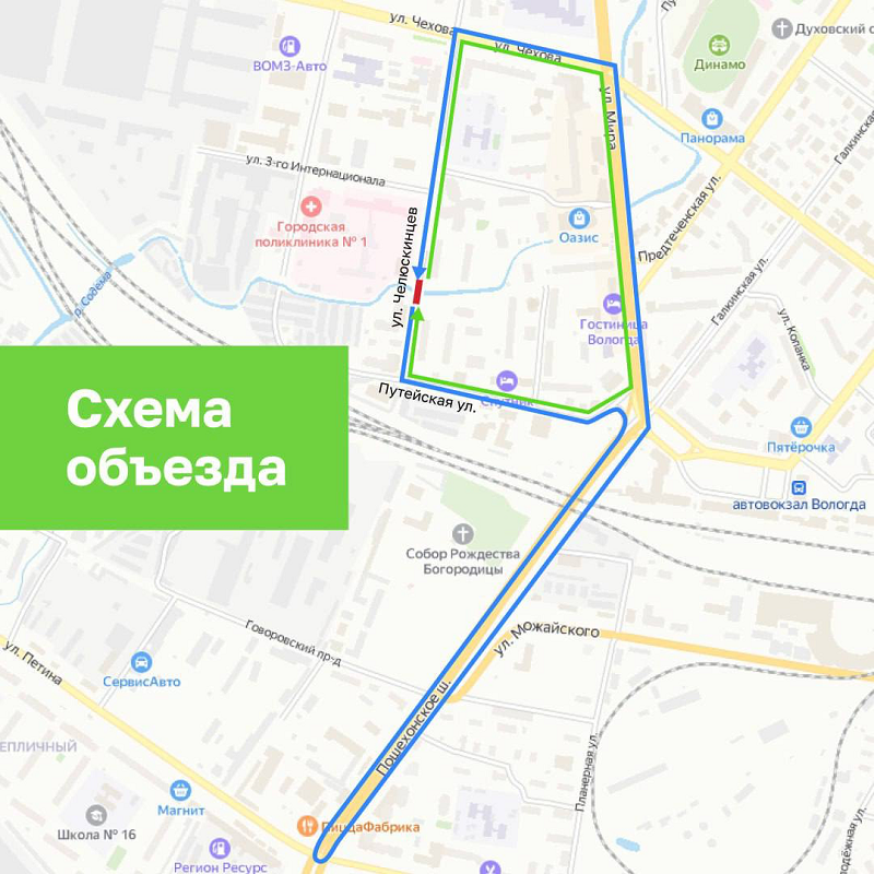 2) ул. Челюскинцев – ул. Путейская – Пошехонское шоссе (до пересечения с ул. С. Преминина) – Пошехонское шоссе (от пересечения с ул. С. Преминина) – ул. Мира – ул. Чехова – ул. Челюскинцев, сообщает ГТРК «Вологда» со ссылкой на пресс-службу администрации города.