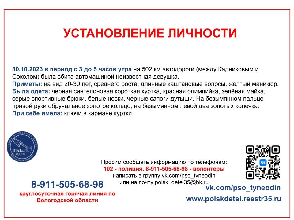 Личность погибшей девушки устанавливается. Волонтёры ПСО «Ты не один» распространили приметы погибшей: на вид 20-30 лет, средний рост, длинные каштановые волосы, жёлтый маникюр. Была одета в чёрную синтепоновую куртку, красную олимпийку, зелёную майку, серые спортивные брюки, белые носки и черные сапоги-дутыши. На руках девушки кольца: обручальное – на правой, ещё два – на левой.