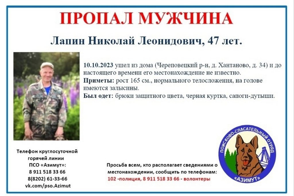 Месяц назад ушел из дома, расположенного в Хантаново, 47-летний Николай Лапин. Его до сих пор не нашли, сообщает ГТРК «Вологда» со ссылкой на официальный сайт Череповца. Информацию о пропавших можно передать по телефонам 61-33-66 и +7 911 518-33-66, 102.