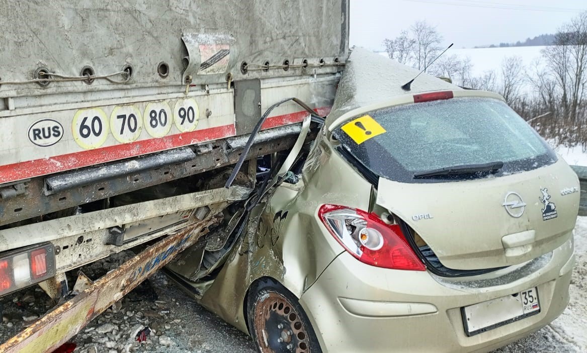 Трагедия произошла сегодня около полудня на обходе города Вологды. По предварительной информации, 19-летняя водитель «Опеля» в районе 15 километра трассы М-8 не справилась с управлением. Девушка не учла погодные условия, не выбрала безопасную скорость и въехала в дорожное ограждение. После этого иномарку отбросило на стоявший полуприцеп.