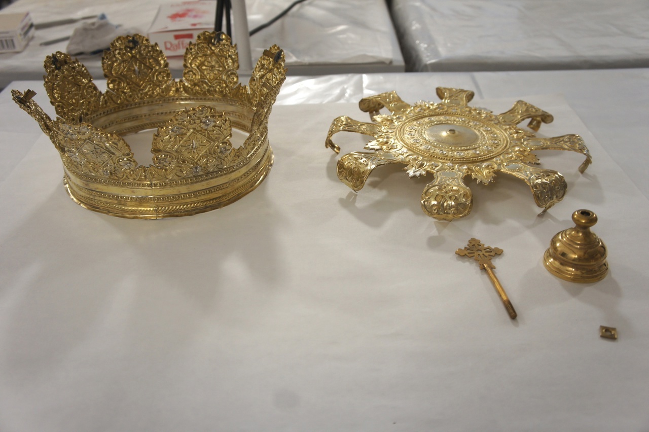 Венцы являлись важным атрибутом религиозного обряда венчания. По форме они представляют собой царскую корону, изготовленную из латунного листа медного сплава толщиной два миллиметра. Каждый экспонат состоит из нескольких деталей: основания, навершия, основной части, прижимной пластинки и крепёжных элементов. Венцы имели загрязнения, деформации и следы коррозии – об этом ранее рассказывали вести35.рф.