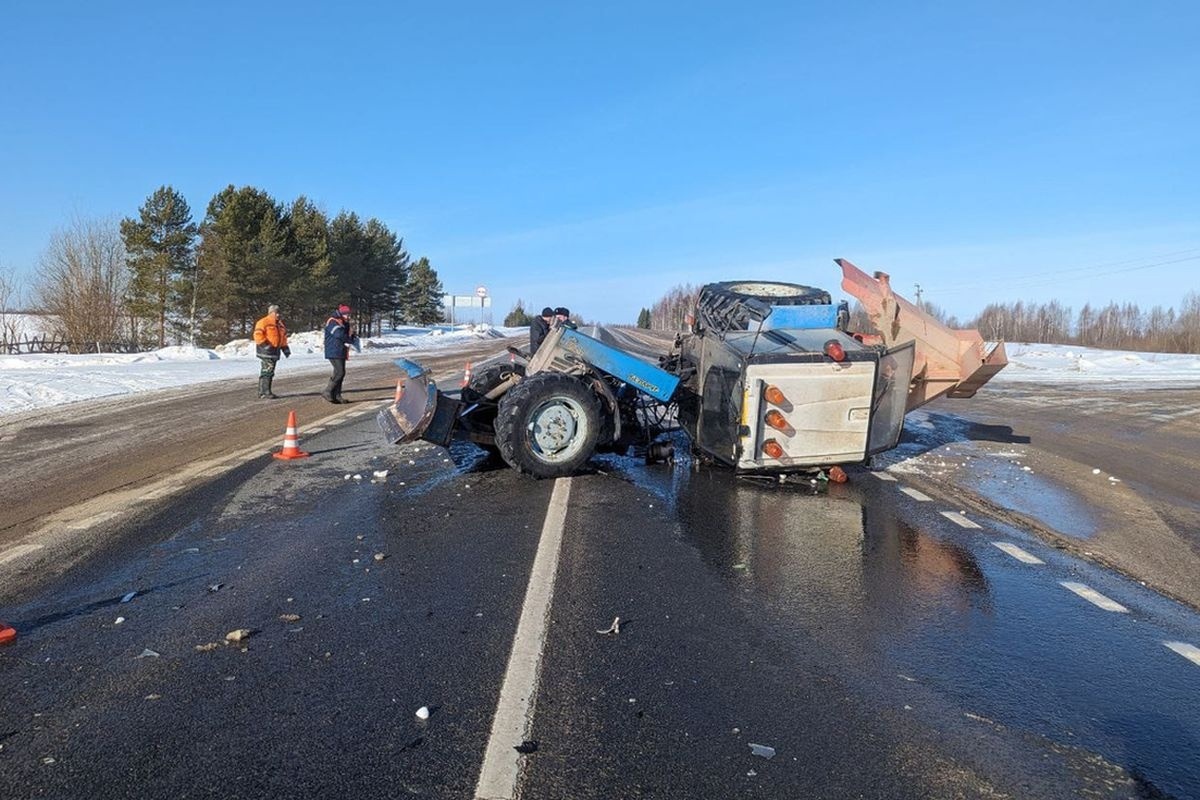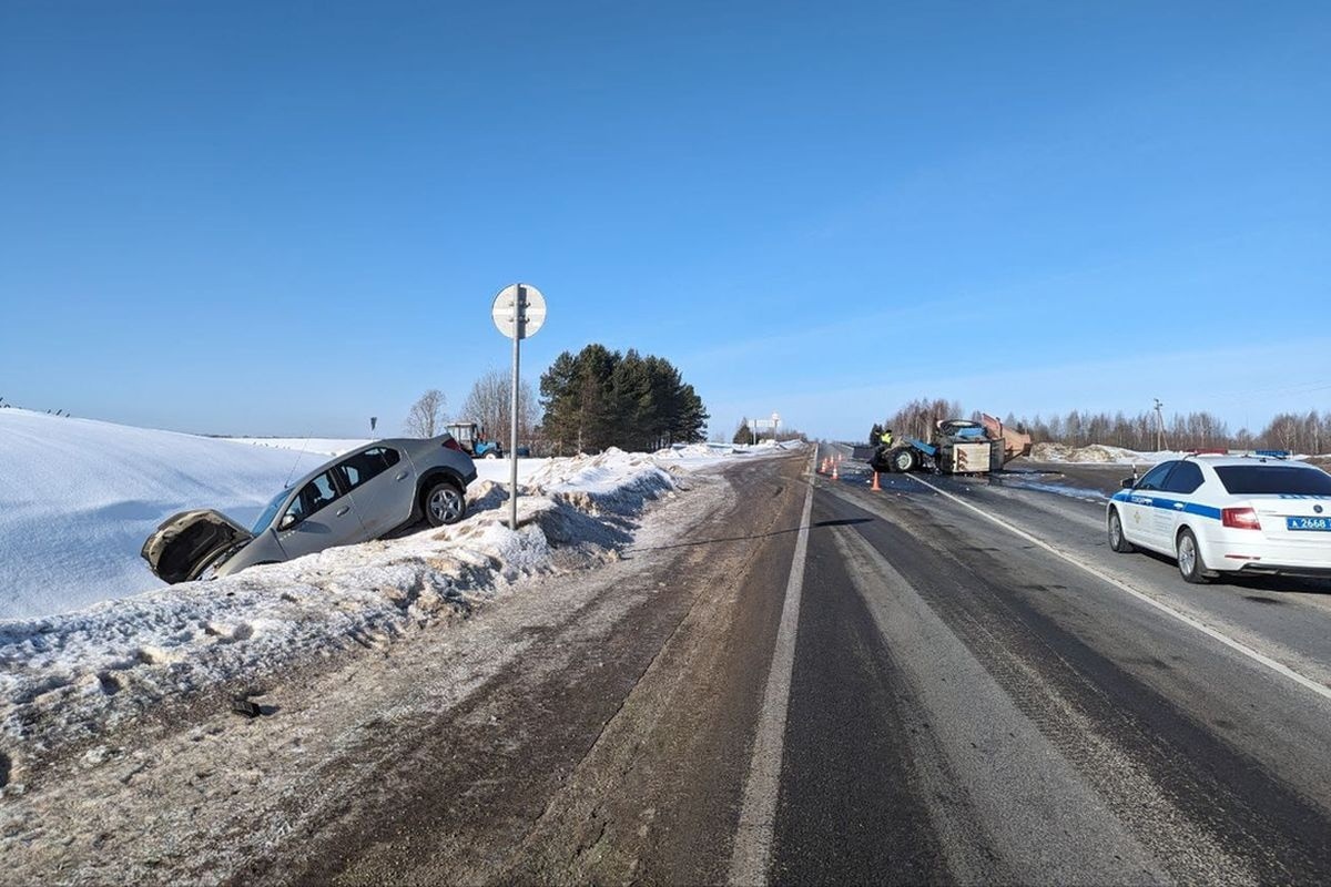 Дорожно-транспортное происшествие случилось сегодня около 10 утра под Вологдой. По предварительной информации, мужчина 1996 года рождения на «Рено Логан» не справился с управлением. Иномарку занесло и выбросило на полосу встречного движения. Там она столкнулась с трактором.