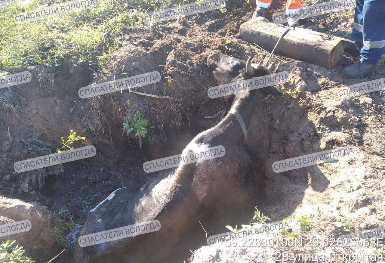 Прибывшие на место сотрудники АСС привязали к рогам телёнка верёвку и вытащили его с помощью автомобиля. Животное оказалось довольно большим – на вид ему около года. Телёнка осмотрели и затем отпустили к матери, – сообщает ГТРК «Вологда» со ссылкой на ТГ-канал городских спасателей.