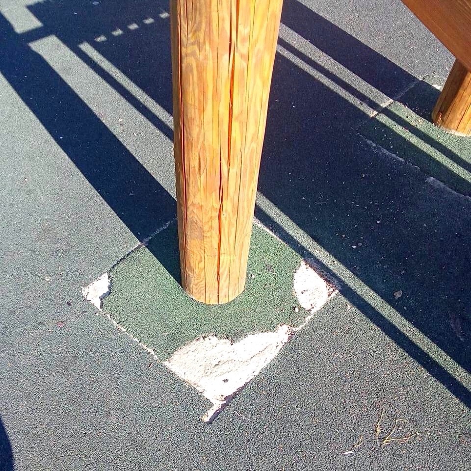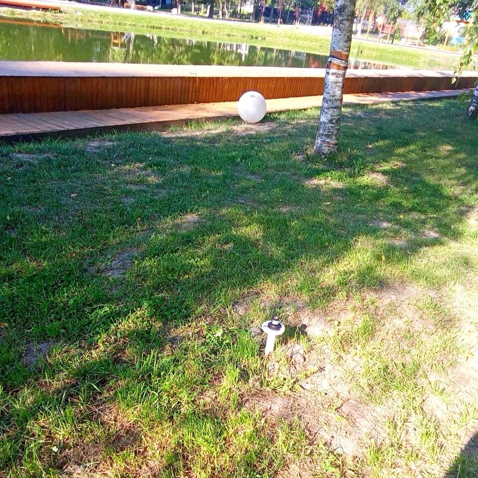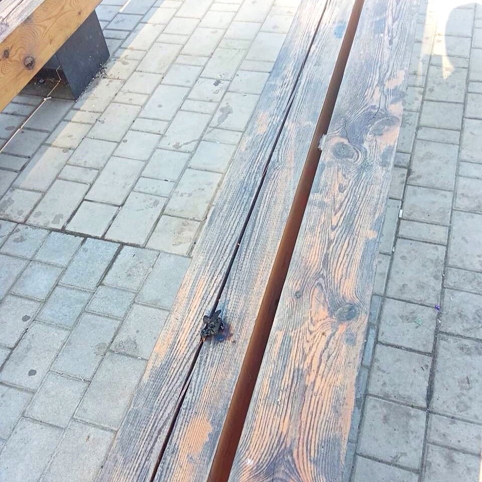 Повреждён уличный шар-светильник, туалетная кабинка, покрытие скамеек у пруда и на площади, резиновое покрытие детской спортивной площадки. Также содрана береста с берёзы.
